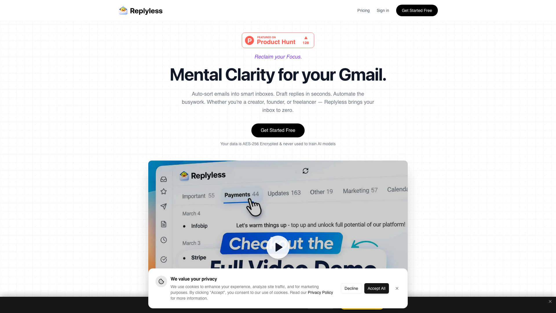 Replylessai는 창작자를 위해 설계된 AI 기반 이메일 인박스로, 중요한 이메일을 효율적으로 정리하고 우선순위를 매기며 응답하는 데 도움을 줍니다.