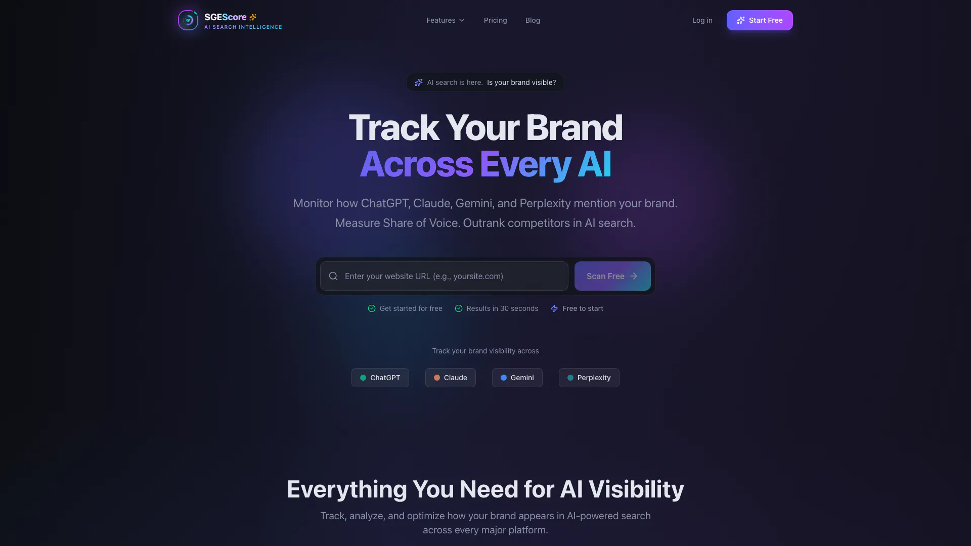 SGEScore는 브랜드가 ChatGPT, Claude, Gemini 및 Perplexity와 같은 플랫폼에서 AI 기반 검색의 존재를 추적, 분석 및 최적화하는 데 도움을 주는 AI 가시성 플랫폼입니다.