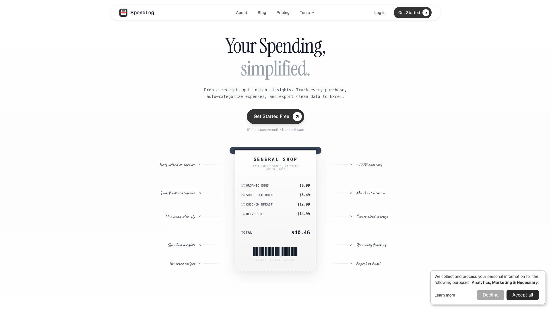 SpendLog은 개인 재정 관리를 단순화하도록 설계된 무료 AI 기반의 경비 추적 애플리케이션입니다. 이 혁신적인 도구는 경비를 자동으로 분류하여 사용자가 지출 습관을 쉽게 추적할 수 있도록 합니다. 영수증 스캔, 보증 추적, 데이터를 Excel로 내보내는 기능과 같은 기능을 통해 SpendLog은 재정 활동을 보다 잘 관리하고자 하는 사용자에게 포괄적인 솔루션을 제공하는 것을 목표로 합니다.