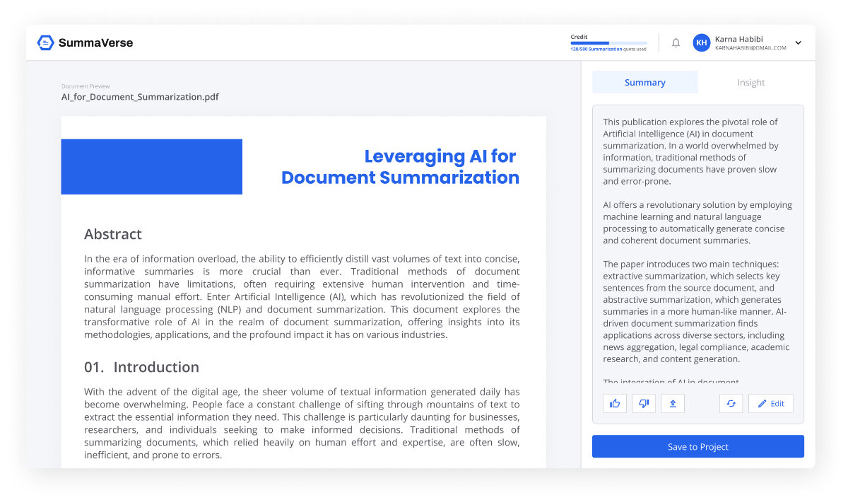 SummaVerse는 긴 문서를 간결하고 유익한 요약으로 압축하기 위해 고급 자연어 처리 기술을 사용하는 문서 요약 도구입니다.