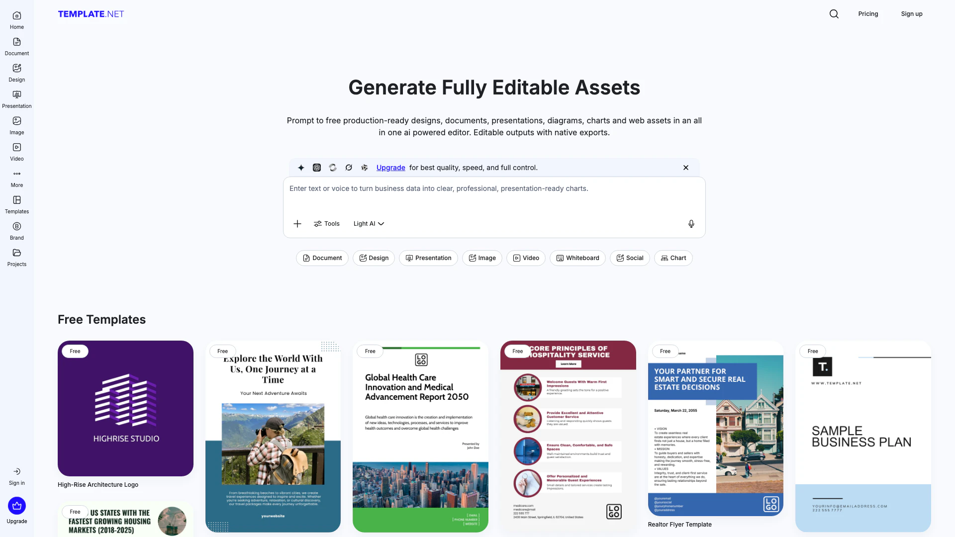 Template.net은 문서, 디자인, 이미지, 비디오, 양식, 차트, 화이트보드 및 프레젠테이션을 단일 통합 편집기에서 생성할 수 있는 무료 AI 플랫폼입니다. 사용자는 텍스트 또는 음성 프롬프트를 사용하여 모든 언어로 콘텐츠를 생성하고, 레이아웃을 시각적으로 사용자 정의하며, PDF, DOCX, PPTX, PNG, JPG, MP4 등 여러 형식으로 파일을 내보낼 수 있습니다.