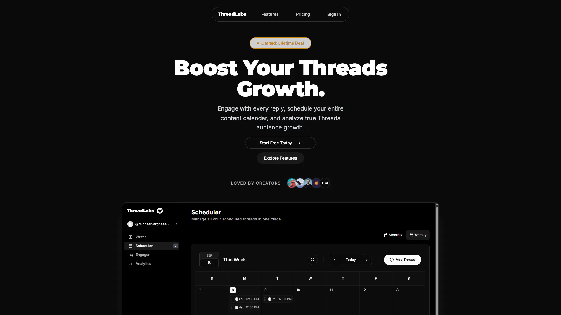 ThreadLabs는 사용자가 Threads 청중을 성장시키고 수익화하는 데 도움을 주기 위해 설계된 강력한 자동화 도구입니다. 게시물 예약, 답글 관리 및 분석 추적과 같은 기능을 제공합니다.
