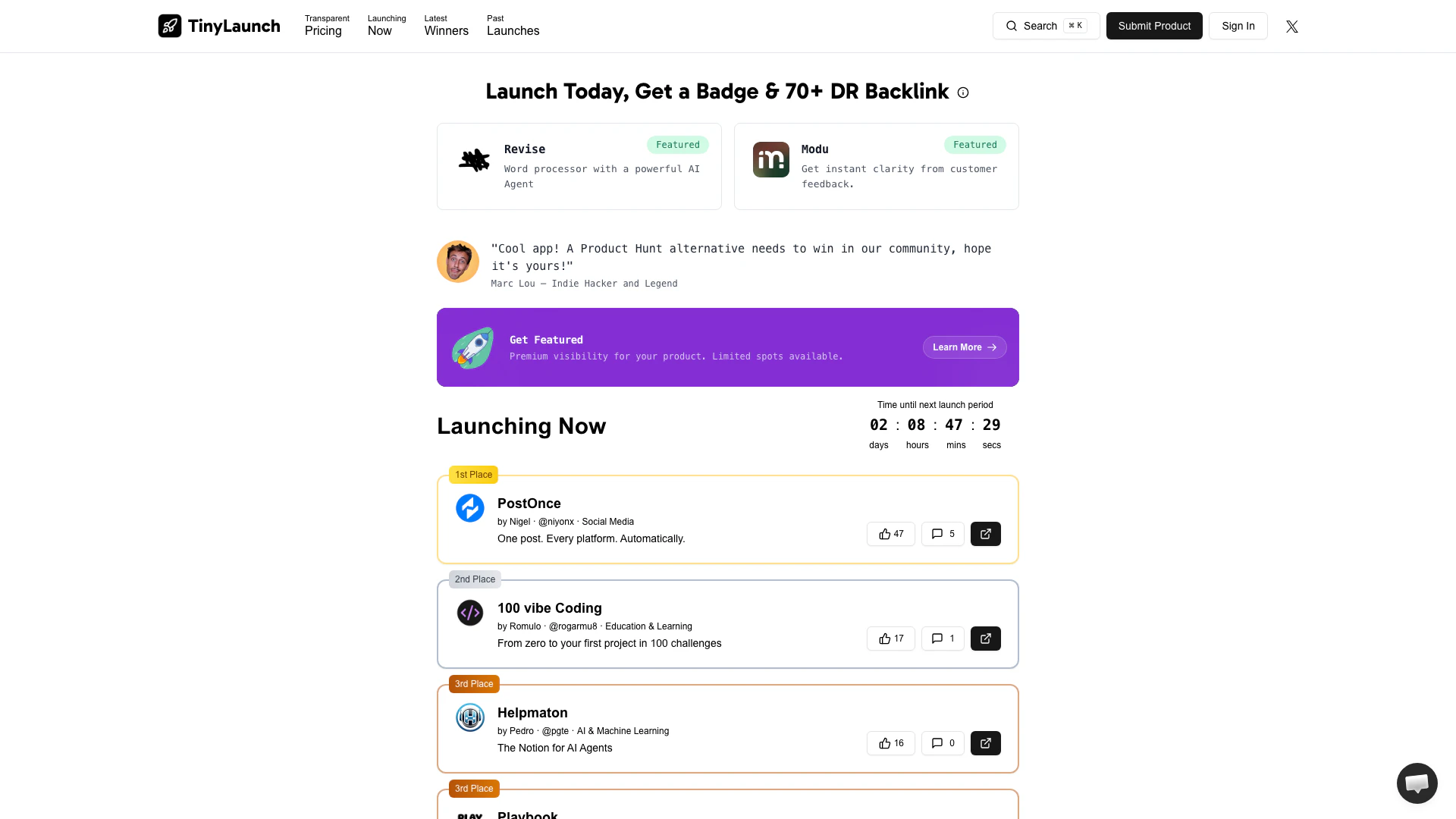 - 높은 권위의 백링크: TinyLaunch는 플랫폼에서 출시된 제품에 대해 높은 권위의 백링크를 제공하여 SEO 및 가시성을 향상시킵니다.