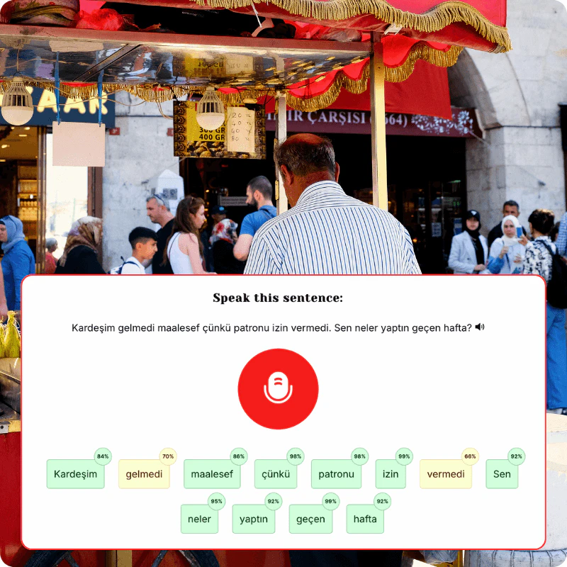 런던에서 혼자 터키어를 배우고 터키로 이사한 후, TurkishFluent는 제 최고의 투자였습니다! 실제 대화와 인터랙티브한 연습은 학습을 즐겁게 만들고 빠르게 발전하는 데 도움을 줍니다. 이제 저는 현지인과 대화하는 것뿐만 아니라 그들을 이해하는 데도 자신감을 느낍니다.