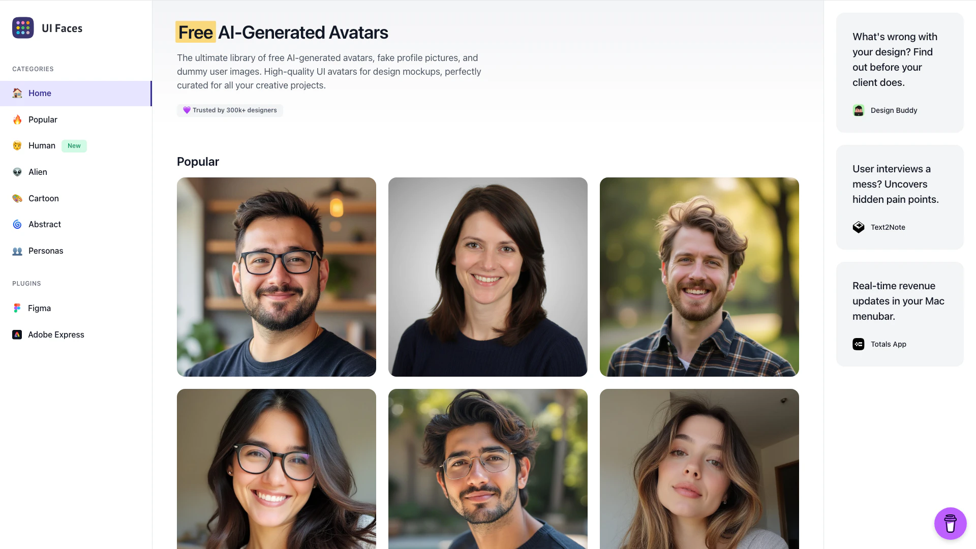 - 다양한 아바타 라이브러리: Uifaces는 다양한 디자인 요구를 충족시키기 위해 인간, 외계인, 만화 및 추상 카테고리를 포함한 다양한 AI 생성 아바타를 제공합니다.