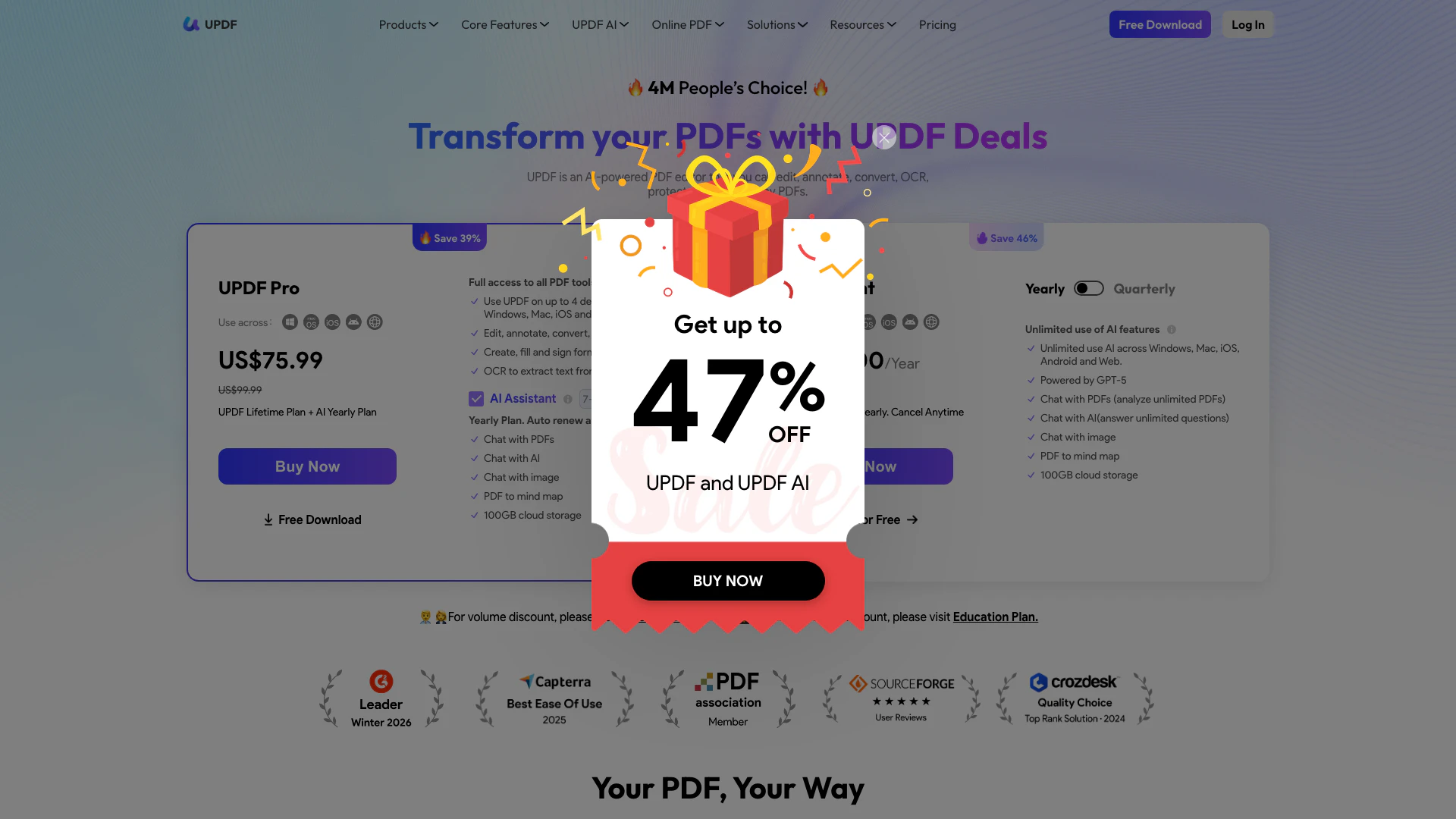 UPDF는 PDF 문서 관리를 간소화하도록 설계된 강력한 AI 기반 PDF 편집기입니다. 편집, 변환, OCR(광학 문자 인식), PDF 요약 등 포괄적인 기능 세트를 사용자에게 제공합니다. 사용자 친화성과 효율성에 중점을 두고 UPDF는 개인이 Windows, Mac, iOS 및 Android를 포함한 여러 플랫폼에서 복잡한 PDF 작업을 원활하게 처리할 수 있도록 합니다. 현재 UPDF는 50% 할인된 프로모션 가격으로 제공되어 사용자가 제한 없이 모든 기능을 이용할 수 있습니다.
