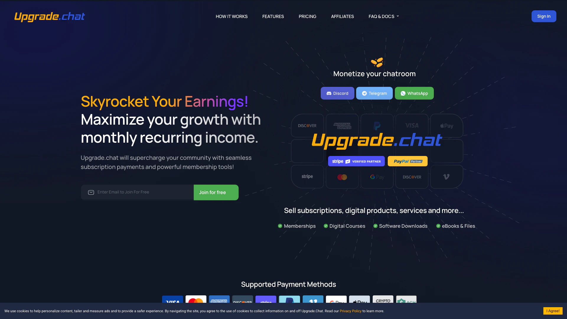 업그레이드는 채팅룸을 자동화된 비즈니스로 변환하기 위해 설계된 혁신적인 플랫폼입니다. PayPal 및 Stripe의 인증된 파트너로서, 업그레이드는 사용자가 결제를 수락하고, 멤버십을 관리하며, 추천을 생성하고, 무료 체험 또는 쿠폰을 제공할 수 있도록 지원합니다. Discord, Telegram 및 WhatsApp과 같은 선호하는 채팅 환경 내에서 모든 작업을 수행할 수 있는 올인원 솔루션으로, 콘텐츠 제작자, 교육자 및 디지털 기업가가 온라인 커뮤니티를 효과적이고 효율적으로 수익화할 수 있도록 합니다.