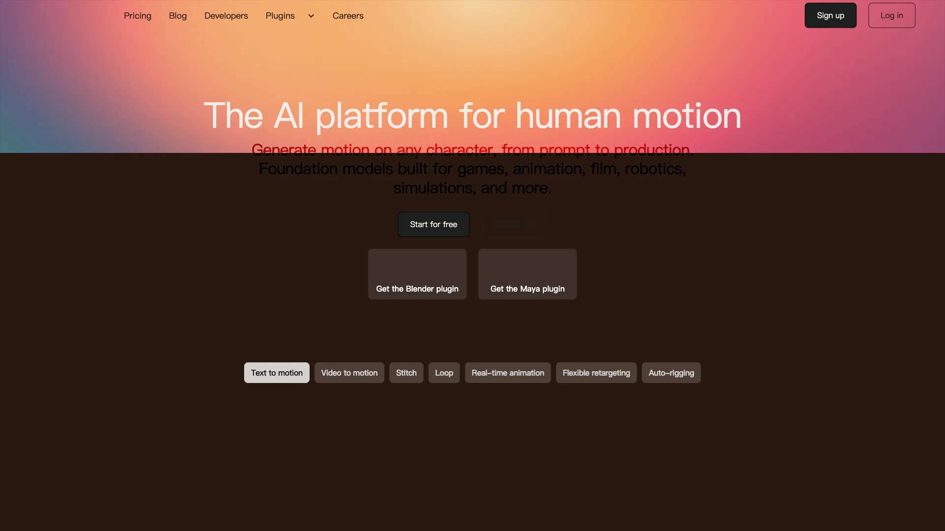 텍스트 또는 비디오에서 무제한 모션 생성, 모션 스티칭, 실시간 모션 녹화, 매월 10개의 캐릭터 업로드 또는 자동 리깅, 무제한 모션:캐릭터 리타겟팅, 100,000개 이상의 모션 라이브러리 접근, 손가락 데이터 포함, 2개의 고유한 맞춤형 캐릭터, 매월 최대 30초의 모션 다운로드, 비상업적 크리에이티브 커먼즈 라이선스, API 및 SDK 접근.