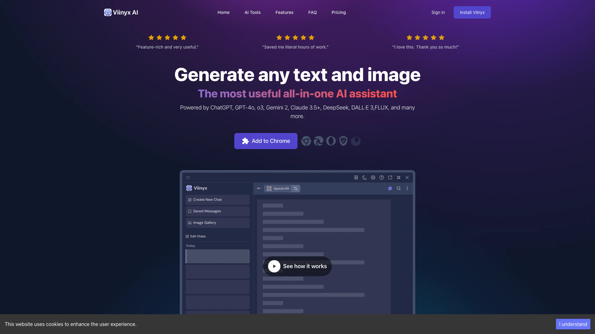 Viinyx를 사용하려면 다음 단계를 따르세요: 1. Chrome 웹 스토어에서 Viinyx AI 확장 프로그램을 설치합니다. 2. 모든 웹 페이지에서 `Option` + `V` (Windows에서는 `Alt` + `V`)를 눌러 채팅 박스를 엽니다. 3. 텍스트 영역이나 리치 텍스트 편집기에서 `//`를 입력하여 AI 작문 도우미를 활성화합니다. 4. 채팅 박스를 통해 AI와 상호작용하여 웹 페이지 요약, 콘텐츠 생성 또는 이미지 생성과 같은 기능을 활용합니다.