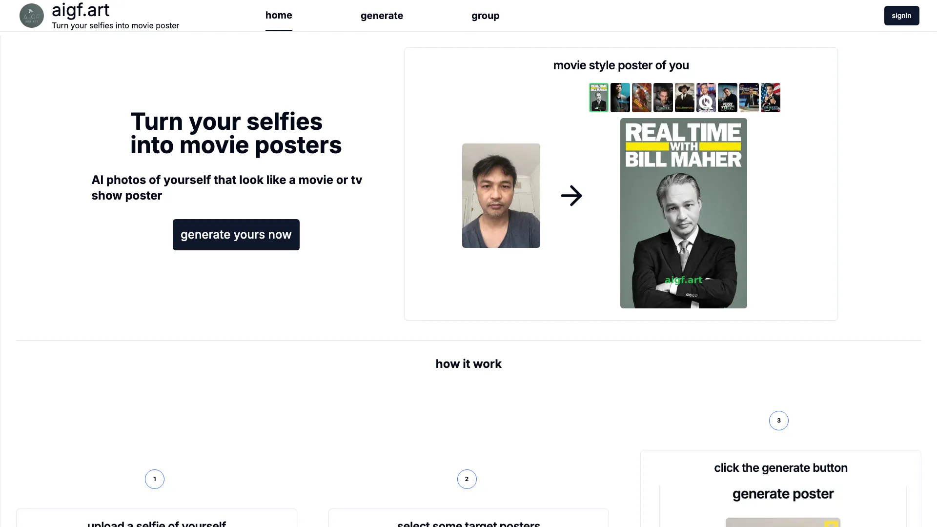 1. Faça upload de uma selfie sua. 2. Selecione alguns pôsteres-alvo. 3. Clique no botão gerar. 4. Baixe o resultado.