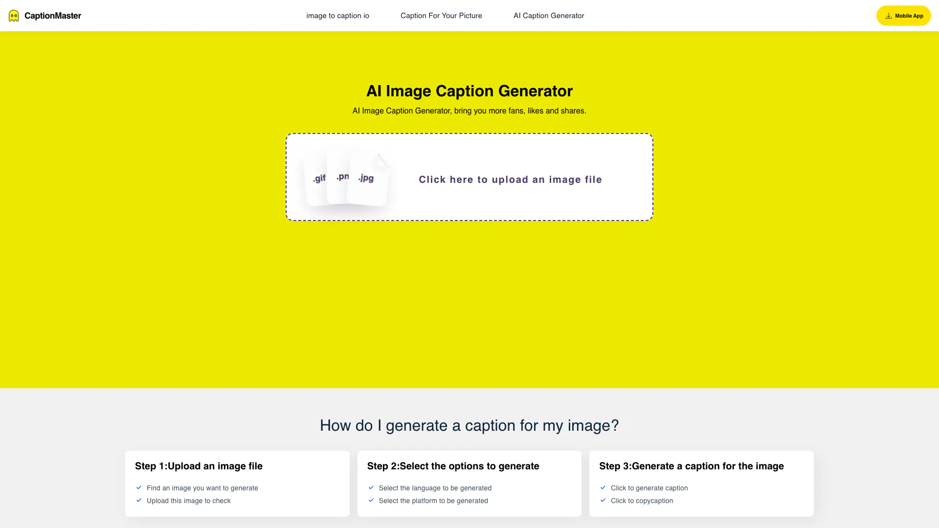 Para usar o Captionmaster, primeiro carregue a imagem que deseja legendar. Em seguida, selecione o idioma e a plataforma desejados. Por fim, clique para gerar a legenda e copie-a para uso.