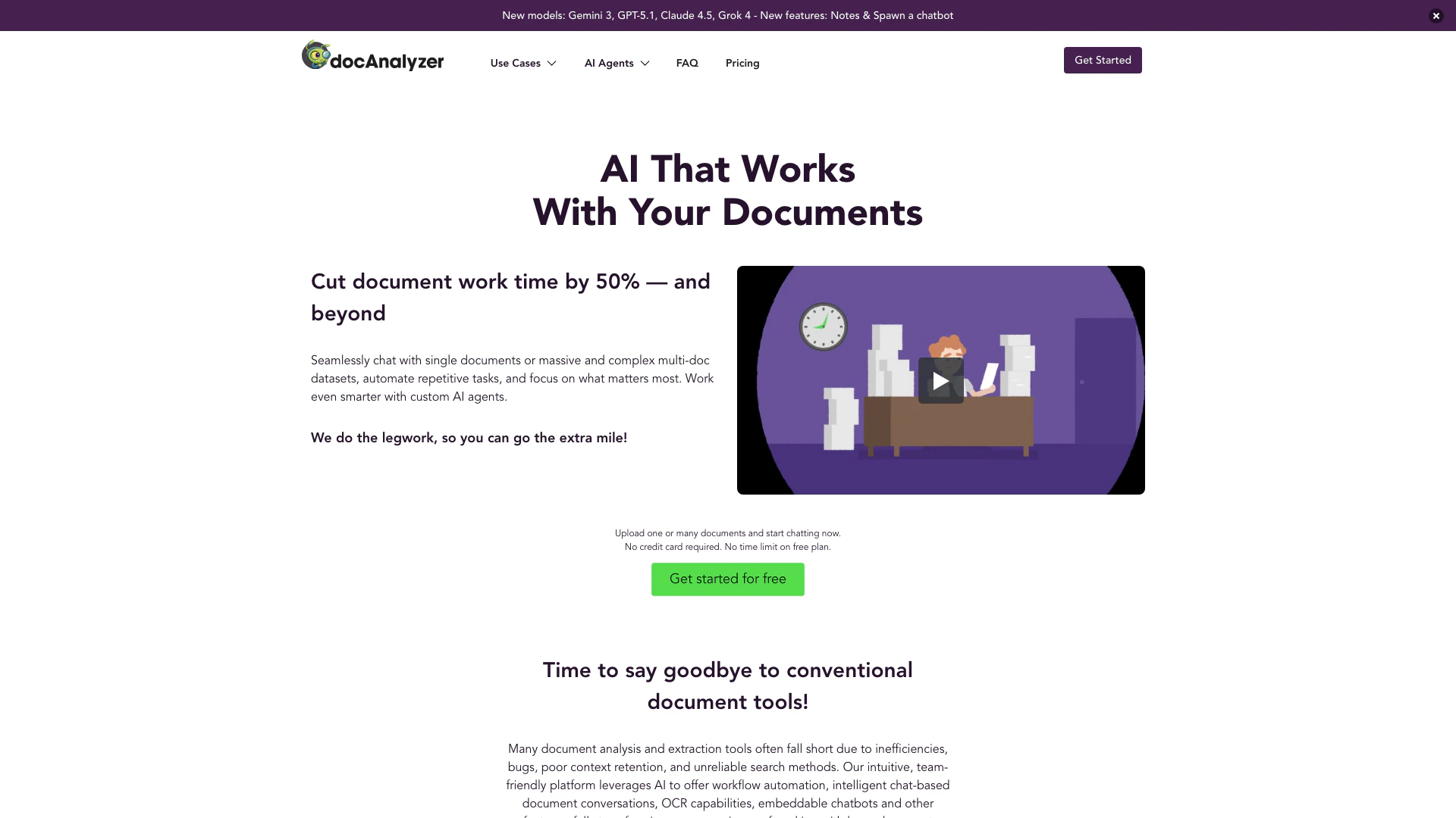 O docAnalyzer.ai é uma plataforma impulsionada por IA que interage com seus documentos de vários formatos, extraindo dados, analisando e resumindo conteúdo, respondendo perguntas e obtendo ajuda de agentes de IA. As principais características incluem análise avançada, agentes de IA automatizados, fácil integração, interatividade e colaboração em equipe.