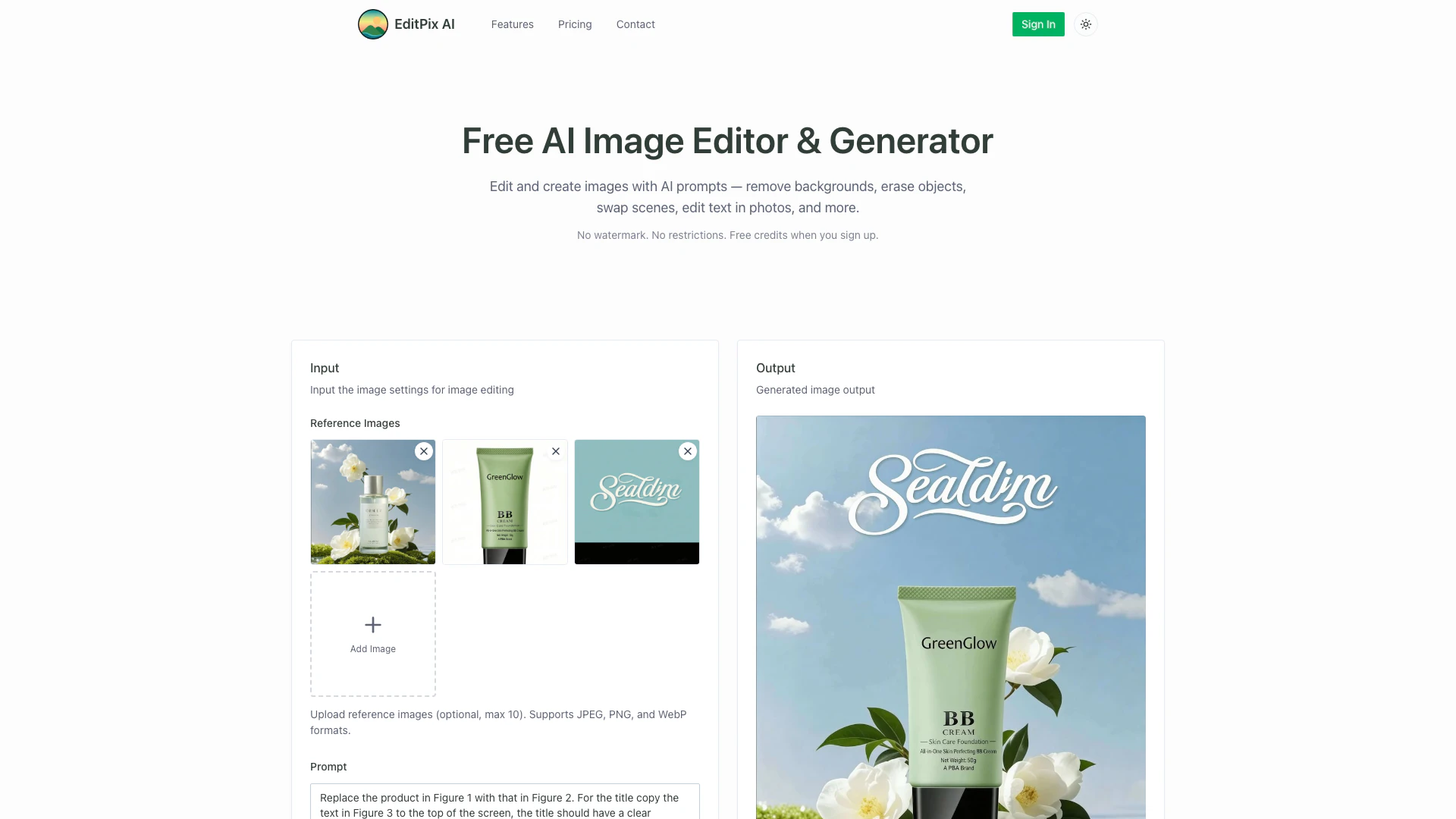 - Sem marca d'água nas edições: Todas as imagens editadas ou geradas com EditPix estão completamente livres de marcas d'água, garantindo um acabamento profissional sem branding.