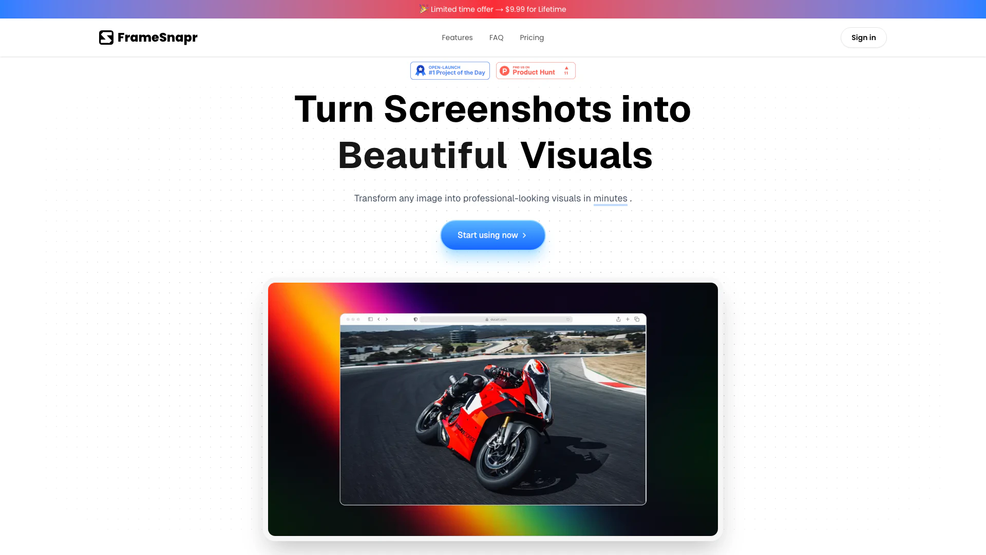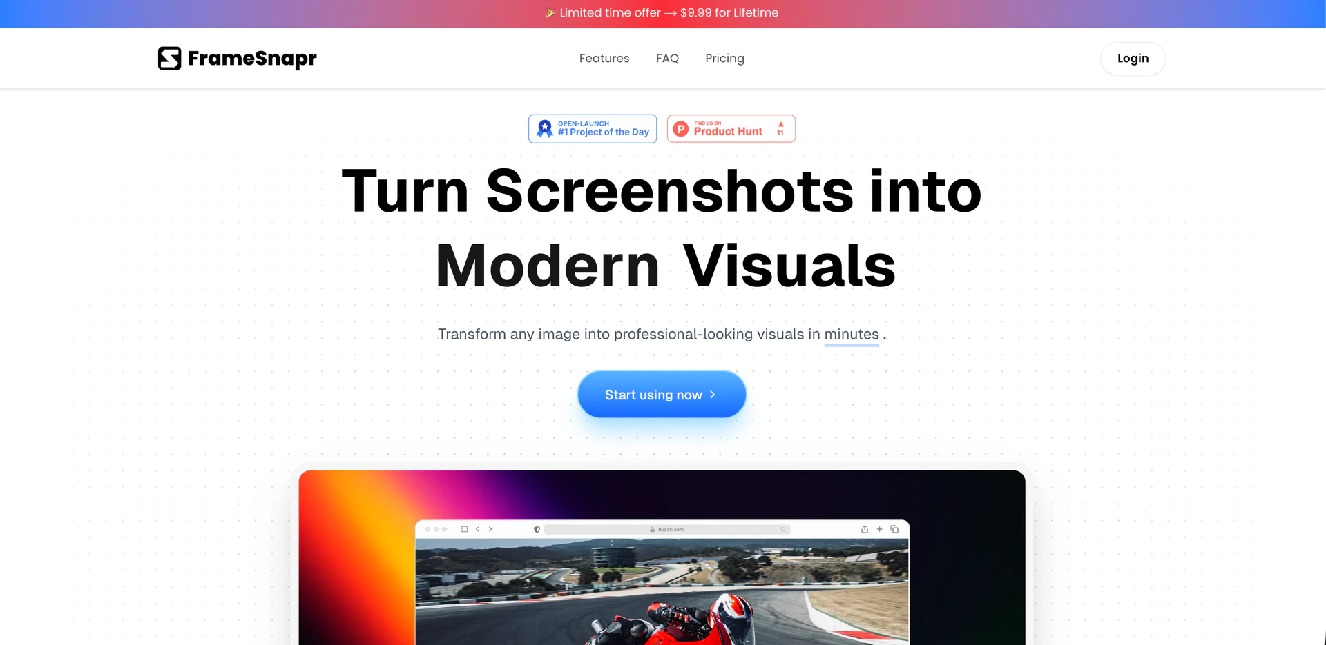Com acesso vitalício, você obtém todos os recursos do FrameSnapr, incluindo a capacidade de criar visuais impressionantes usando macOS, Arc, iPhone, Safari e quadros do MacBook, gradientes e fundos personalizados, controles de edição completos, exportações de alta qualidade sem marca d'água e atualizações futuras.