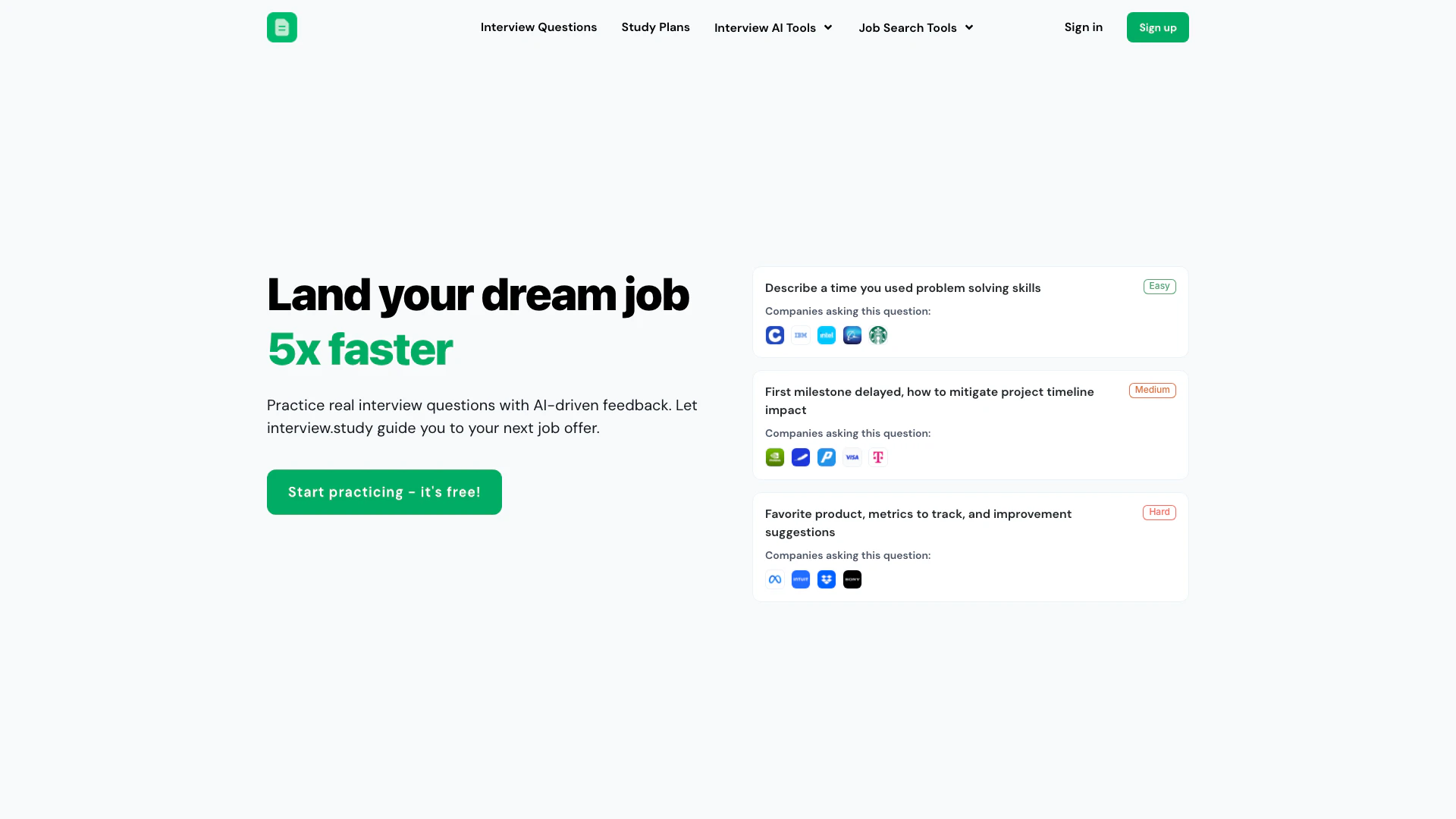 - Preparação de Entrevista Abrangente: Interview.study oferece uma ampla gama de perguntas específicas do setor e feedback impulsionado por IA, ajudando os usuários a se prepararem de forma abrangente para entrevistas.