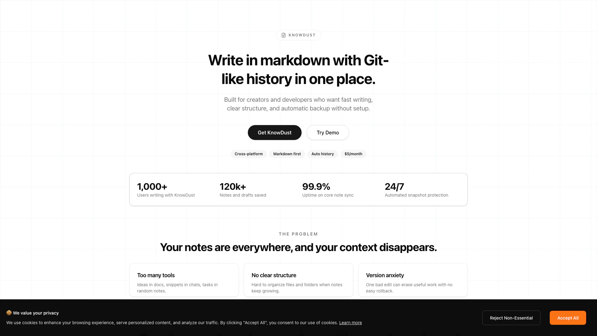 O Knowdust é voltado para criadores, desenvolvedores, escritores e qualquer pessoa que precise de uma solução confiável de anotação que priorize velocidade e organização. É particularmente benéfico para indivíduos que frequentemente alternam entre escrever e visualizar suas notas, bem como para aqueles que exigem um ambiente seguro e estruturado para gerenciar suas ideias e rascunhos.