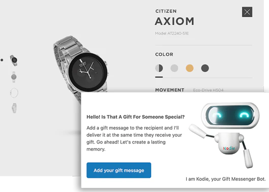 - Pedidos de Presente em E-commerce: Os comerciantes podem usar o Kodie para permitir que os clientes enviem mensagens personalizadas com cada compra de presente, aprimorando a experiência geral de presenteio.