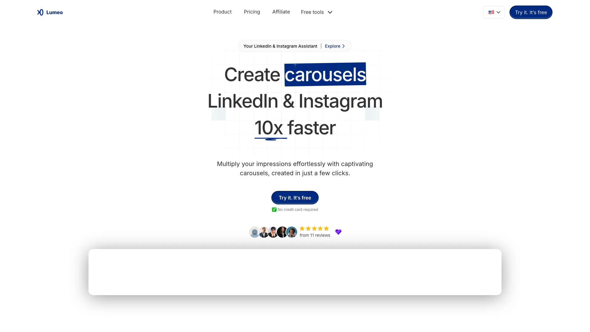 - Visite o site do Lumeo e acesse o editor de carrosséis gratuito.