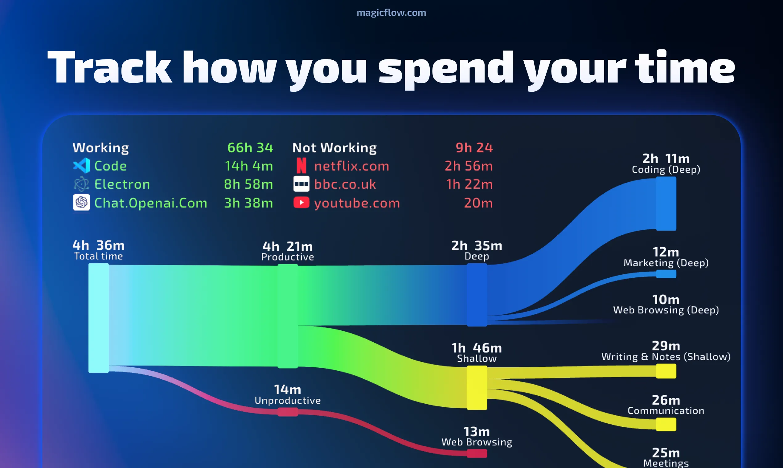 O Magicflow 2.0 é um rastreador de produtividade com inteligência artificial, projetado para ajudar fundadores e criadores a se concentrarem no trabalho profundo. Ele mede a produtividade, rastreia o trabalho profundo e identifica distrações, fornecendo insights práticos para aumentar a produtividade.