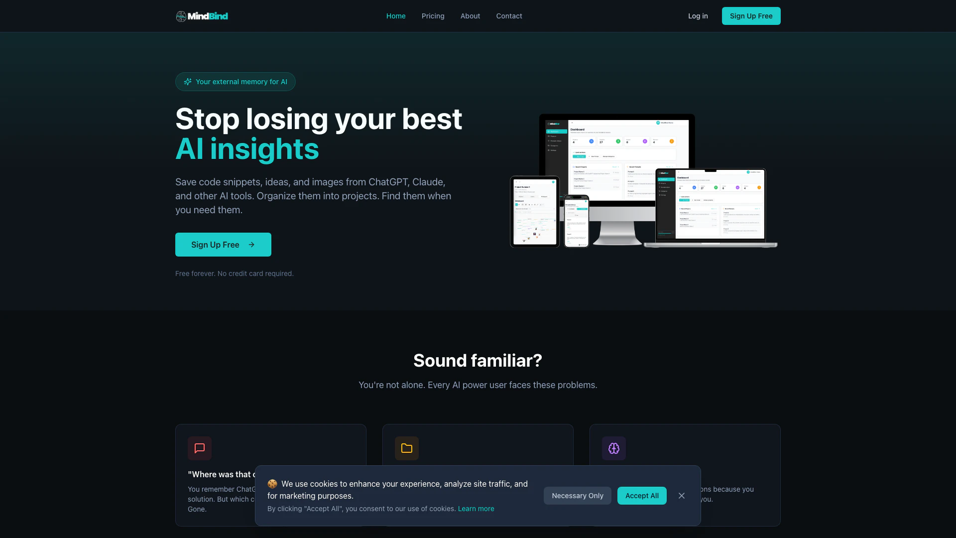 O MindBind é voltado para usuários avançados de IA, desenvolvedores, pesquisadores e qualquer pessoa que interaja frequentemente com ferramentas de IA como ChatGPT e Claude. É particularmente benéfico para indivíduos que precisam capturar e organizar insights, como trechos de código, ideias e imagens, de suas conversas com IA. Profissionais de tecnologia, marketing e criação de conteúdo podem aumentar significativamente sua produtividade utilizando o MindBind para otimizar seu fluxo de trabalho e manter uma base de conhecimento estruturada.