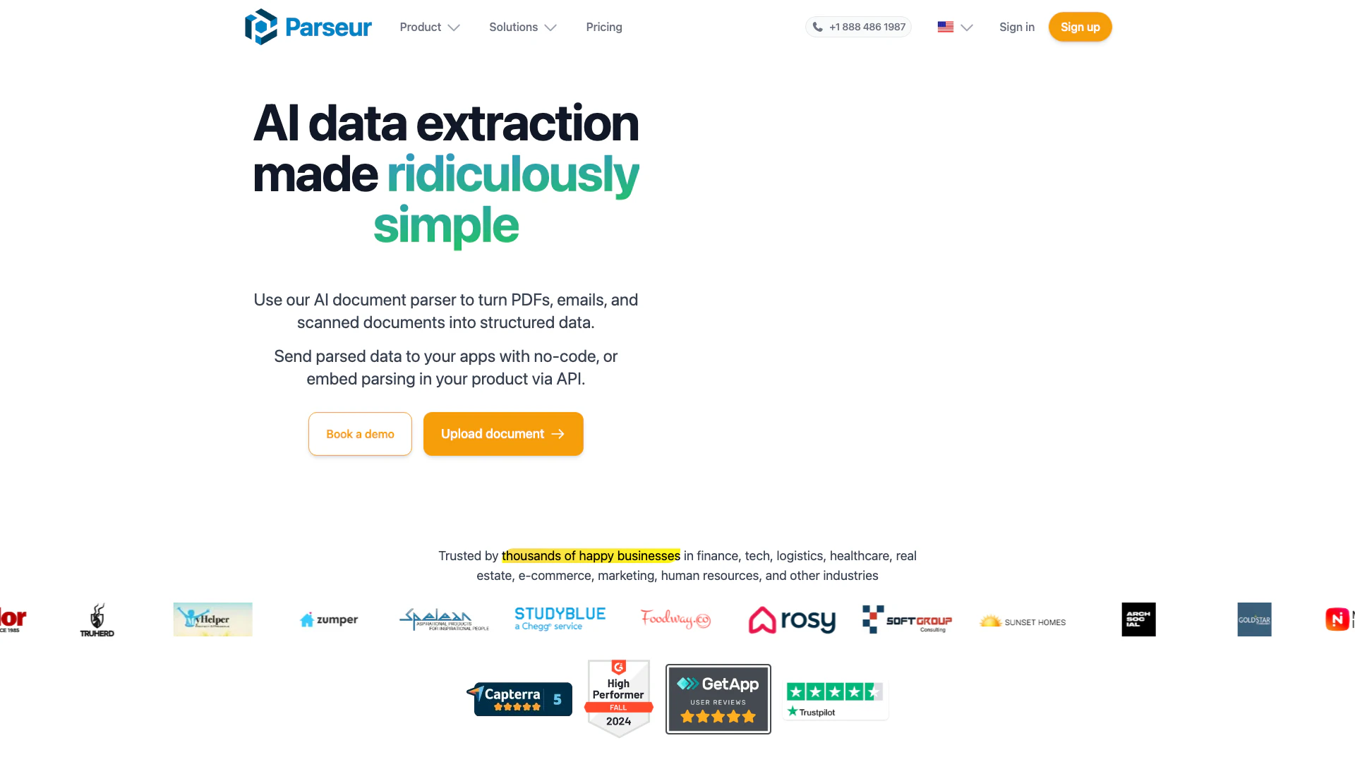 - Extração de Dados Baseada em IA: O Parseur utiliza tecnologia de IA para automatizar a extração de dados de vários tipos de documentos, garantindo alta precisão e eficiência.