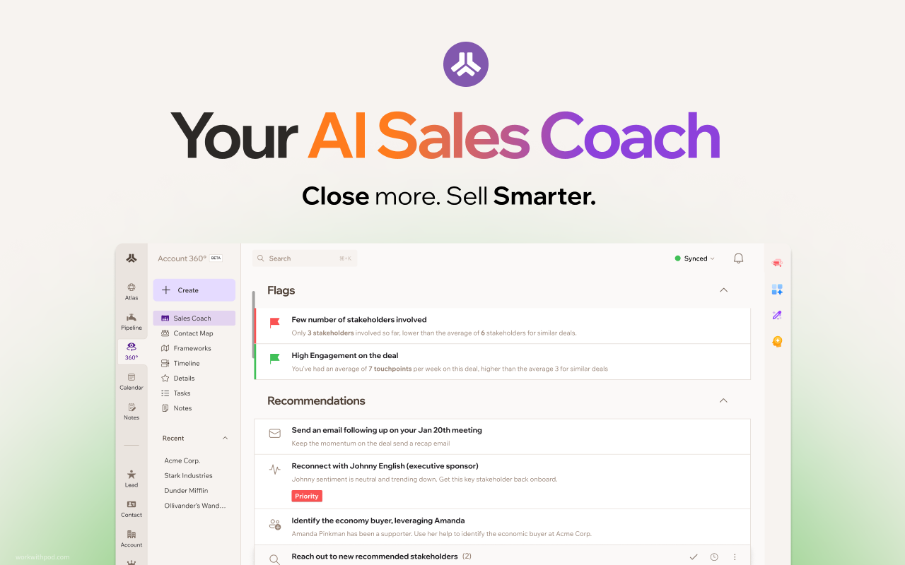 - Inteligência de Negócio AI: A Inteligência de Negócio AI da Pod ajuda os vendedores a tomarem as melhores ações em seu pipeline.