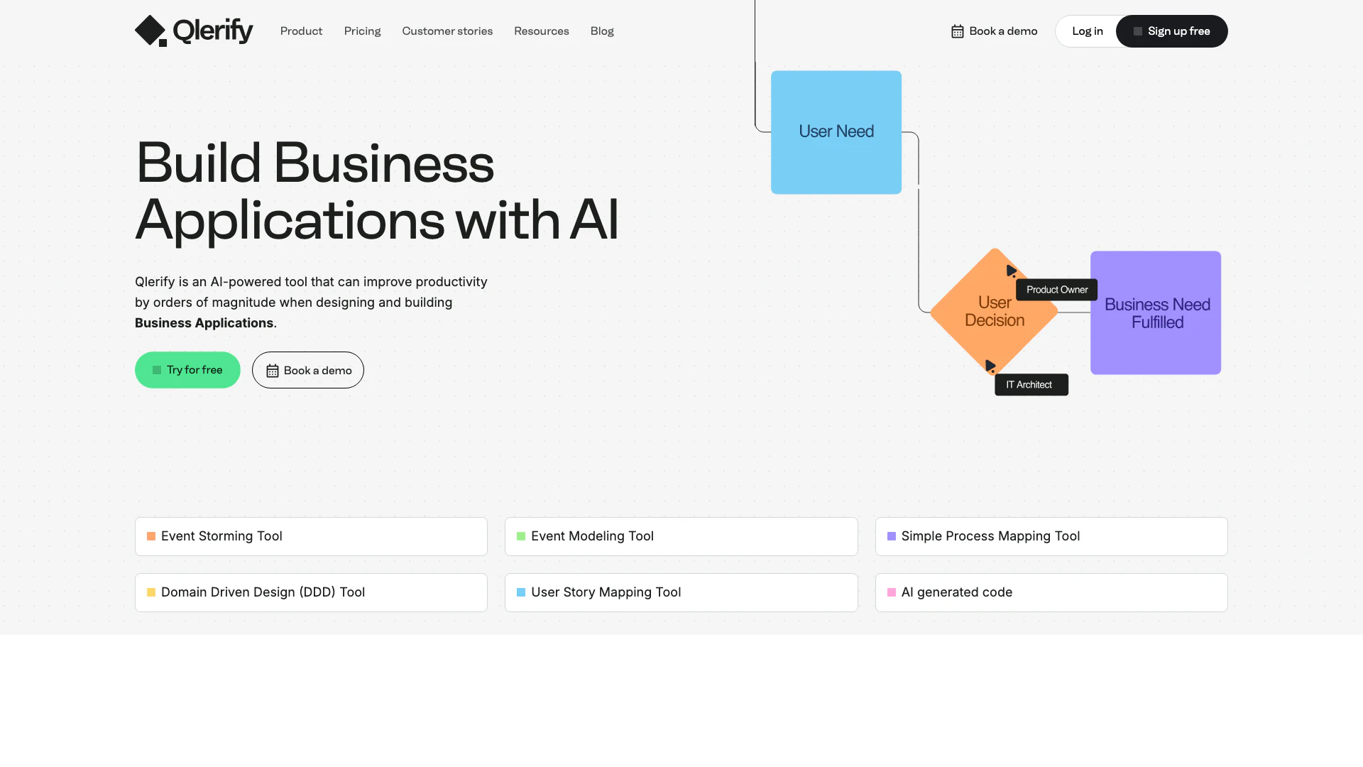 - Suporta Design Orientado a Domínio: O Qlerify incorpora princípios de Design Orientado a Domínio (DDD), permitindo que os usuários criem modelos de domínio que se alinhem de perto com as necessidades de negócios, melhorando os resultados do projeto.