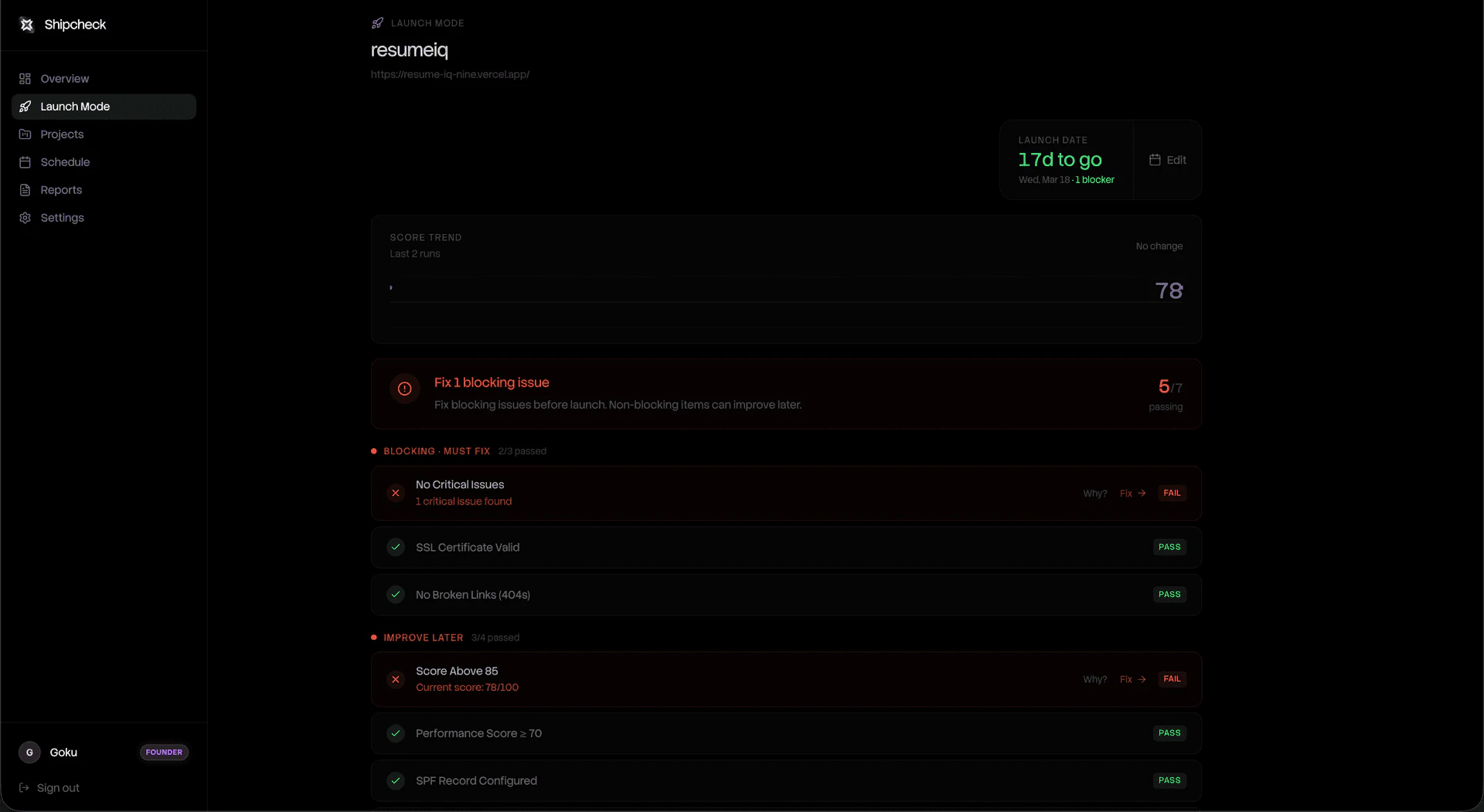 O Shipcheck audita seu site em busca de problemas que bloqueiam o lançamento, verificando links quebrados, configurações de DNS incorretas, tags meta ausentes e mais de 40 outros pontos de verificação para garantir que seu site esteja pronto para o lançamento.