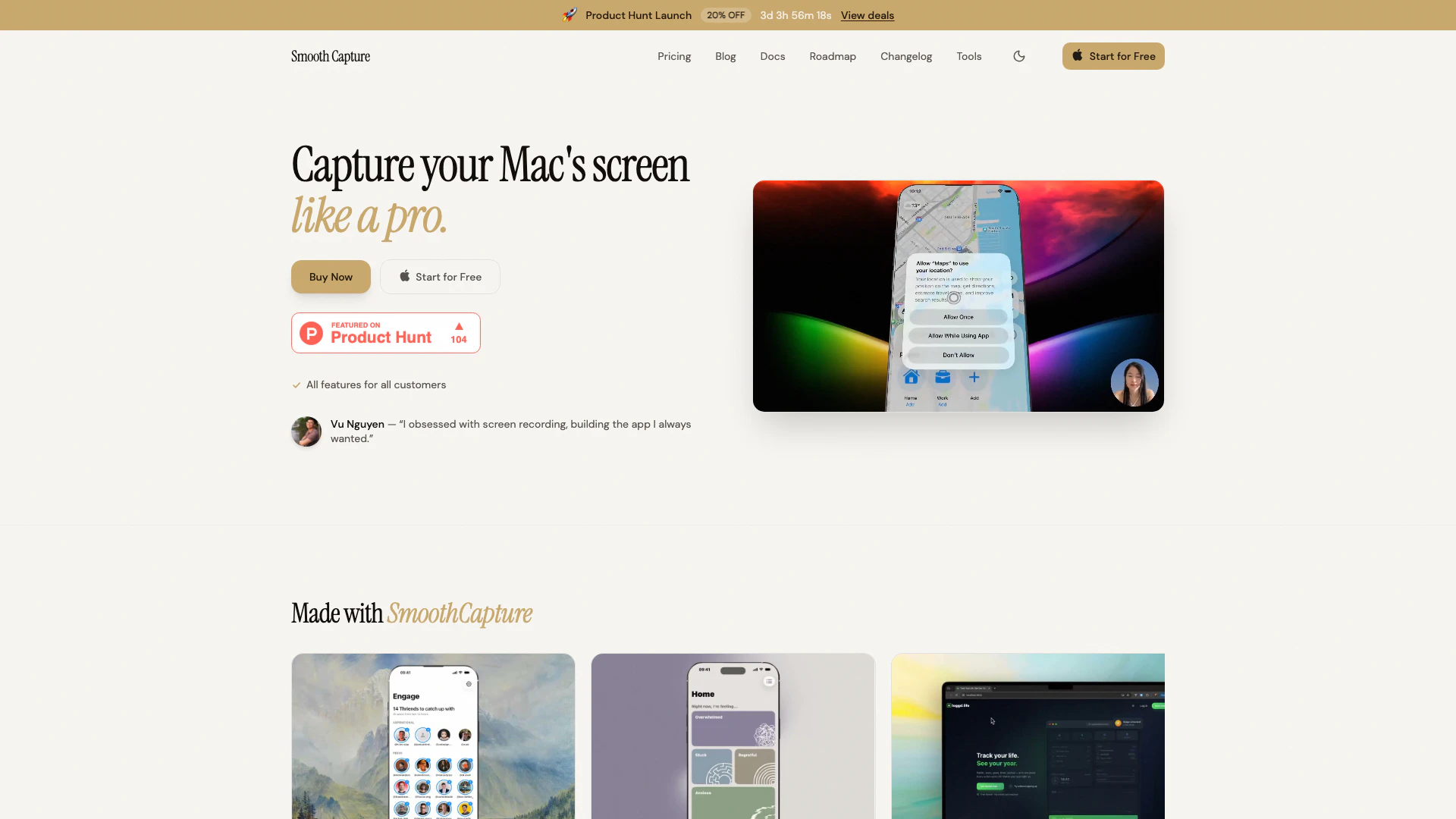Eu já experimentei todas as ferramentas de gravação de tela disponíveis. O Smooth Capture é o primeiro que faz minhas gravações parecerem profissionais sem nenhum esforço.