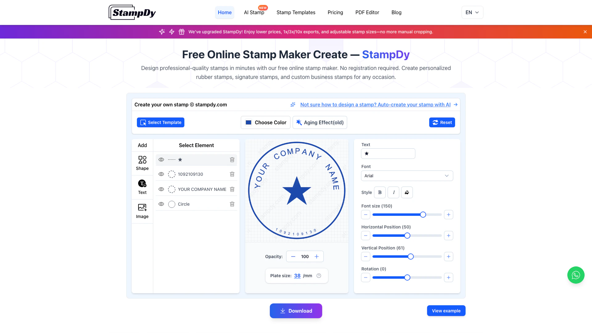 Stampdy é uma plataforma online inovadora que permite aos usuários projetar e baixar carimbos de borracha personalizados, selos de empresa e logotipos instantaneamente. Esta ferramenta atende tanto indivíduos quanto empresas, permitindo que criem carimbos de qualidade profissional sem a necessidade de habilidades de design. Com sua interface amigável, o Stampdy oferece um criador de carimbos online gratuito que simplifica o processo de criação de carimbos, tornando-o acessível para qualquer pessoa que queira adicionar um toque pessoal a seus documentos ou branding.