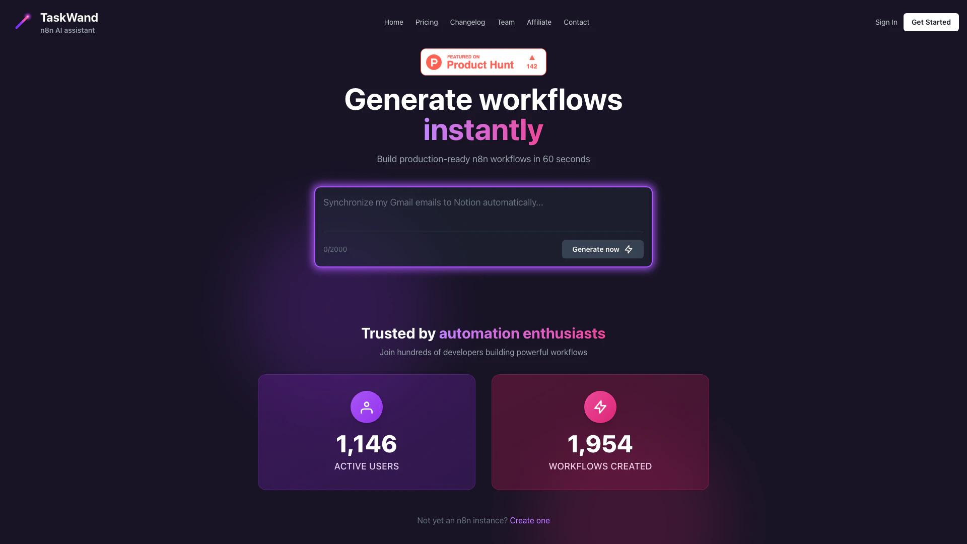 - Geração Instantânea de Fluxo de Trabalho: O TaskWand permite que os usuários gerem fluxos de trabalho n8n complexos em apenas 60 segundos, aumentando significativamente a produtividade.