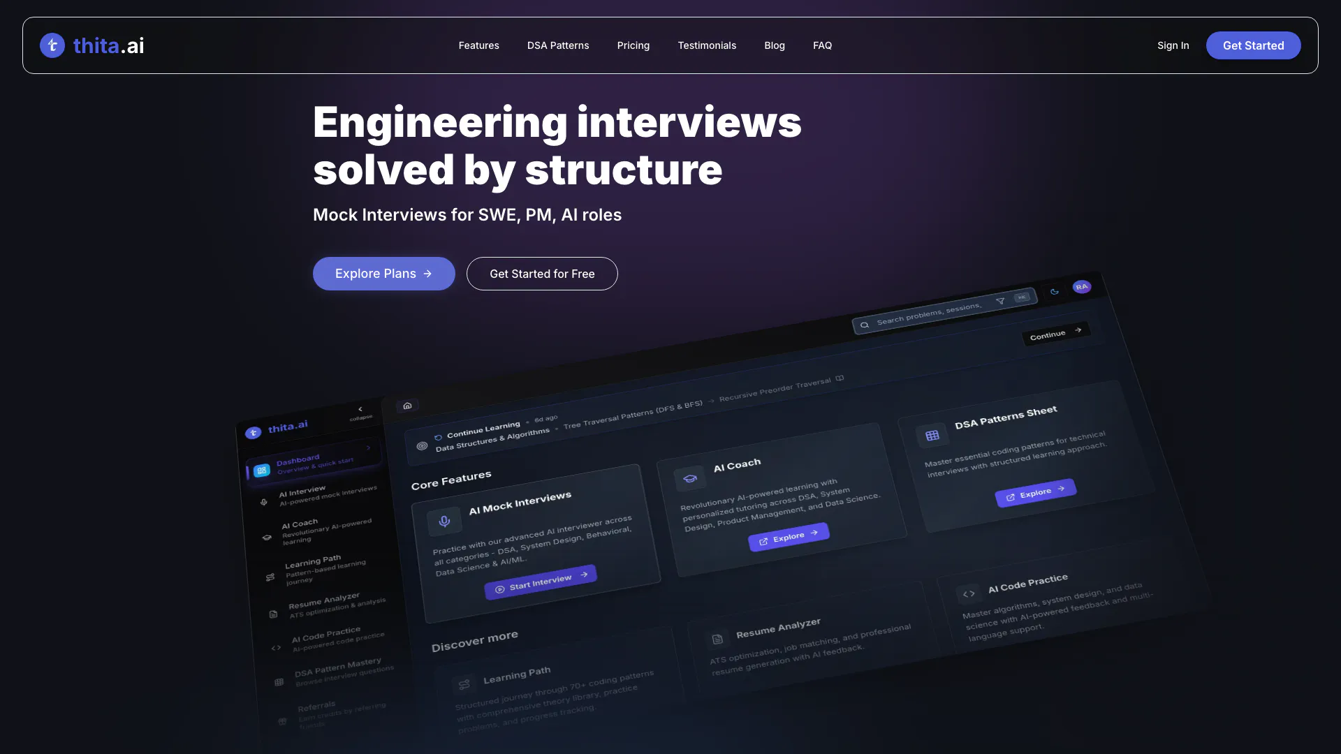 - Recursos de Aprendizagem Abrangentes: A Thita oferece acesso a mais de 90 padrões de DSA, entrevistas de design de sistemas e caminhos de aprendizagem estruturados para várias áreas técnicas, garantindo uma preparação completa.