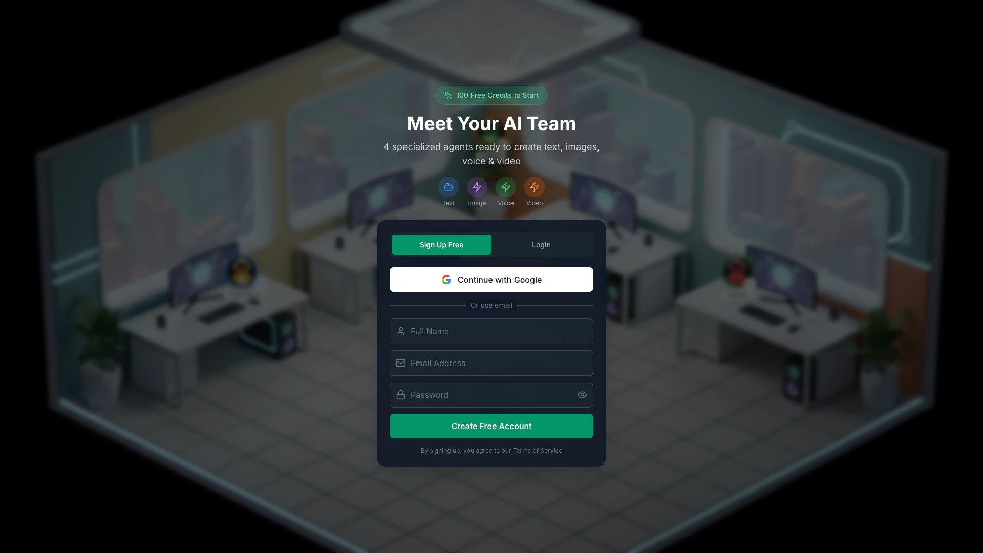 - Após o registro, você receberá 100 créditos gratuitos para começar a usar os agentes de IA.