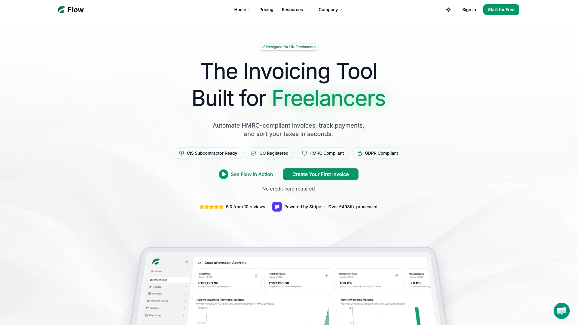 O Flow é uma ferramenta de faturamento projetada para freelancers automatizarem faturas em conformidade com a HMRC, rastrear pagamentos e gerenciar impostos de forma eficiente.