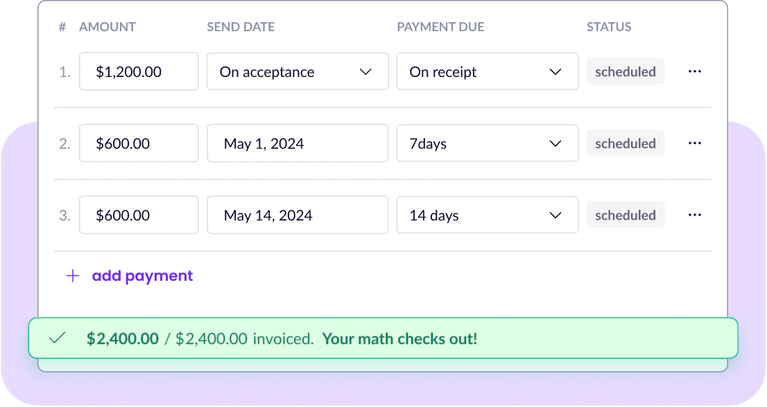 - Envie Faturas: Após a aceitação da sua proposta, converta-a em uma fatura com um clique e configure cronogramas de pagamento automáticos.