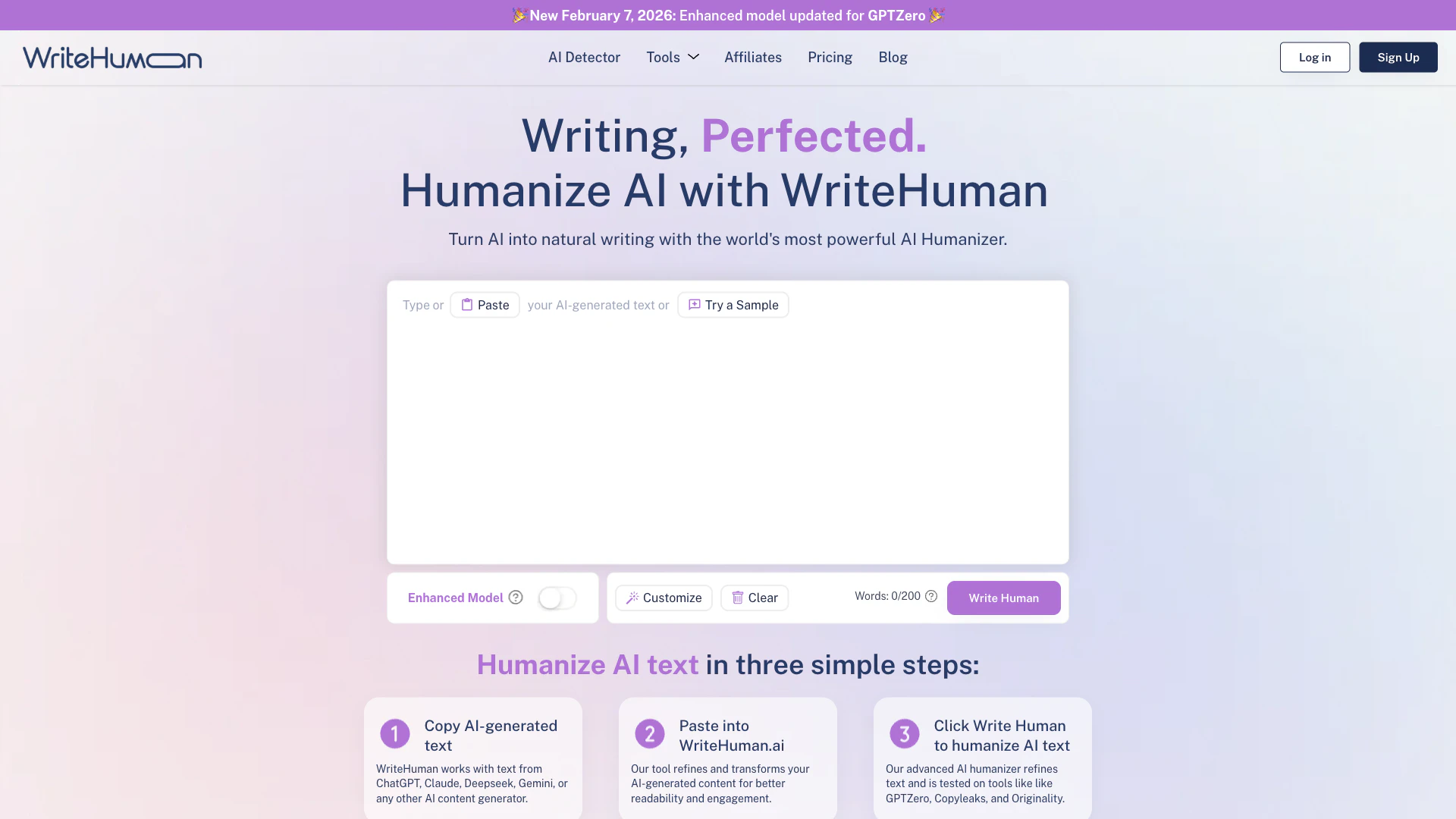WriteHuman é uma ferramenta de IA que humaniza textos gerados por IA, transformando-os em uma escrita natural e de qualidade humana. Funciona com vários geradores de conteúdo de IA, como ChatGPT, Claude e outros.