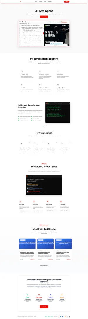 O Xtest oferece uma ampla gama de recursos poderosos para aprimorar sua experiência de teste: - Testes impulsionados por IA: Gere automaticamente suítes de teste abrangentes usando modelos avançados de IA. - Automação inteligente de navegador: Automatize interações com qualquer elemento da web, incluindo formulários e botões. - Geração de código: Exporte instantaneamente testes como scripts Playwright, Cypress ou Selenium. - Testes visuais: Compare automaticamente alterações de UI e detecte regressões visuais. - Extração e validação de dados: Extraia texto, valide formulários, verifique links e verifique o conteúdo da página com precisão. - Testes em múltiplos navegadores: Realize testes em navegadores principais como Chrome, Firefox, Safari e Edge.