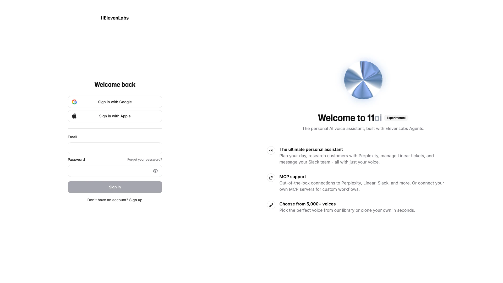 - Sign in to your ElevenLabs account on the 11ai platform using your email, Google, or Apple account.