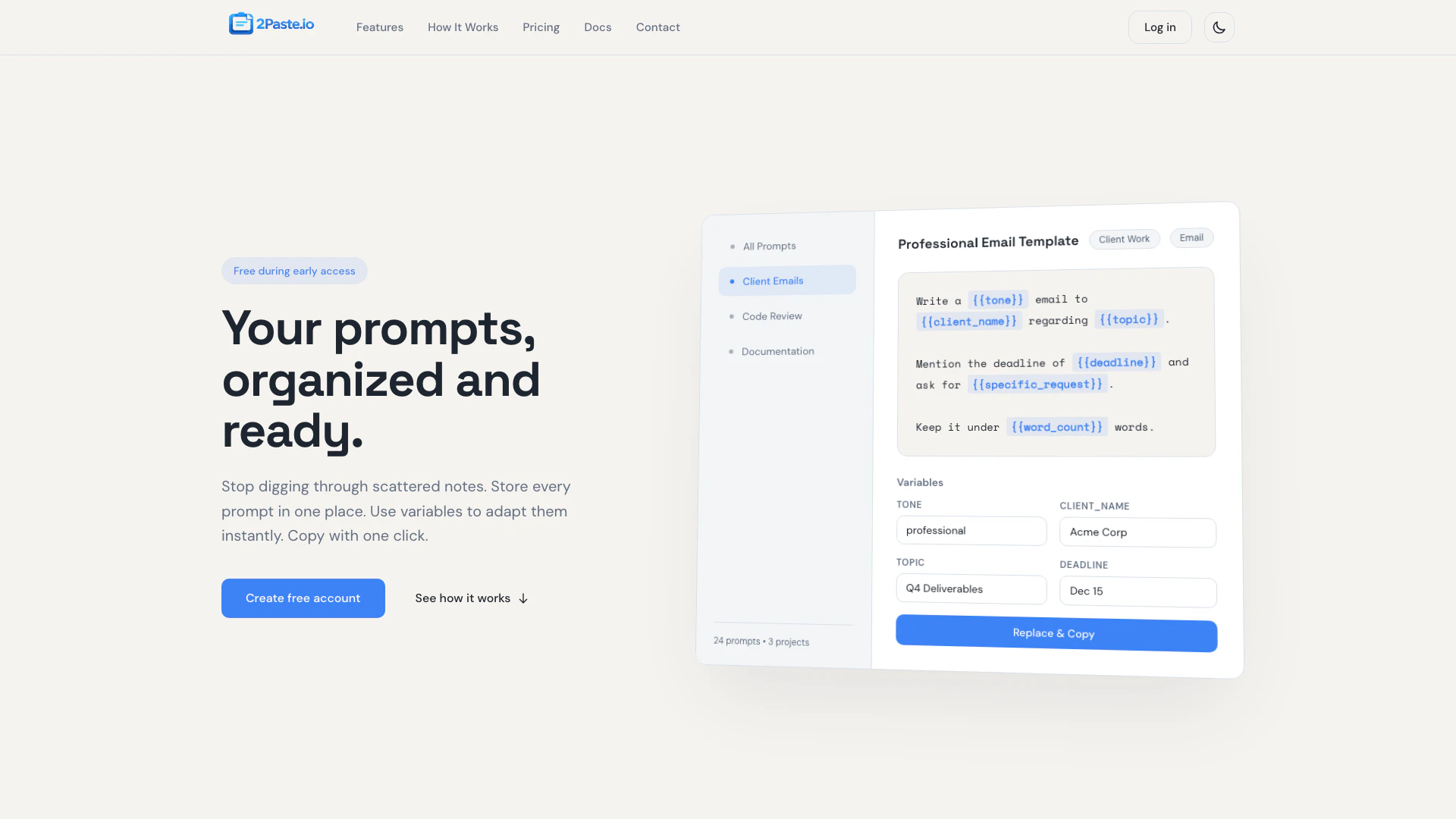 2paste is an innovative tool designed to help developers and AI power users save, organize, and instantly copy their prompts with variable replacement[2]. It serves as a centralized prompt management[1] system, allowing users to store all their prompts in one place, eliminating the hassle of sifting through scattered notes. With its user-friendly interface, 2paste enables users to create reusable templates that can be customized on the fly, making it an essential resource for anyone who frequently works with prompts in various applications.