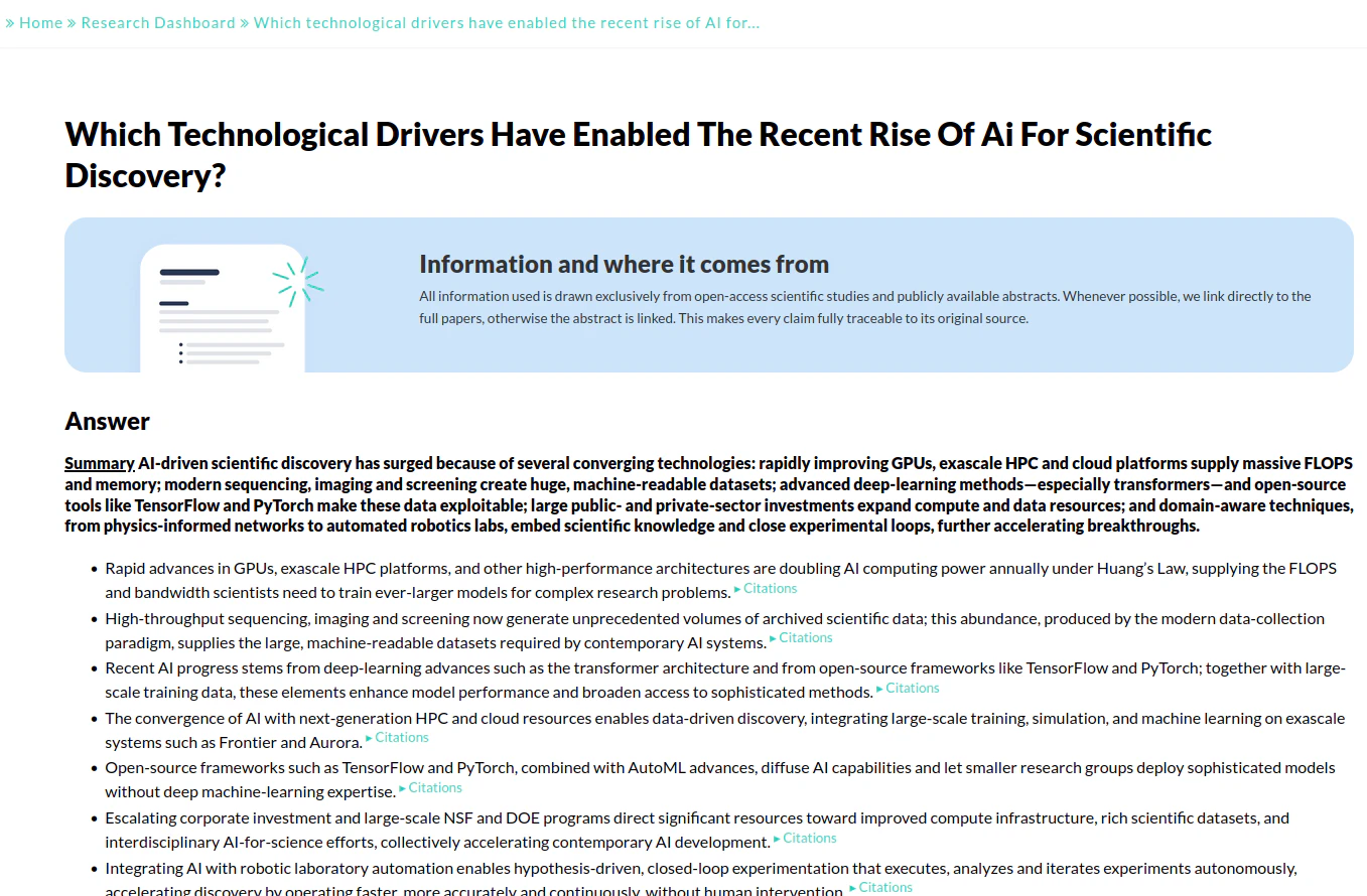 - Properly Cited Sources: Every answer generated includes verifiable citations, allowing users to trace back to the original sources for accuracy and credibility.