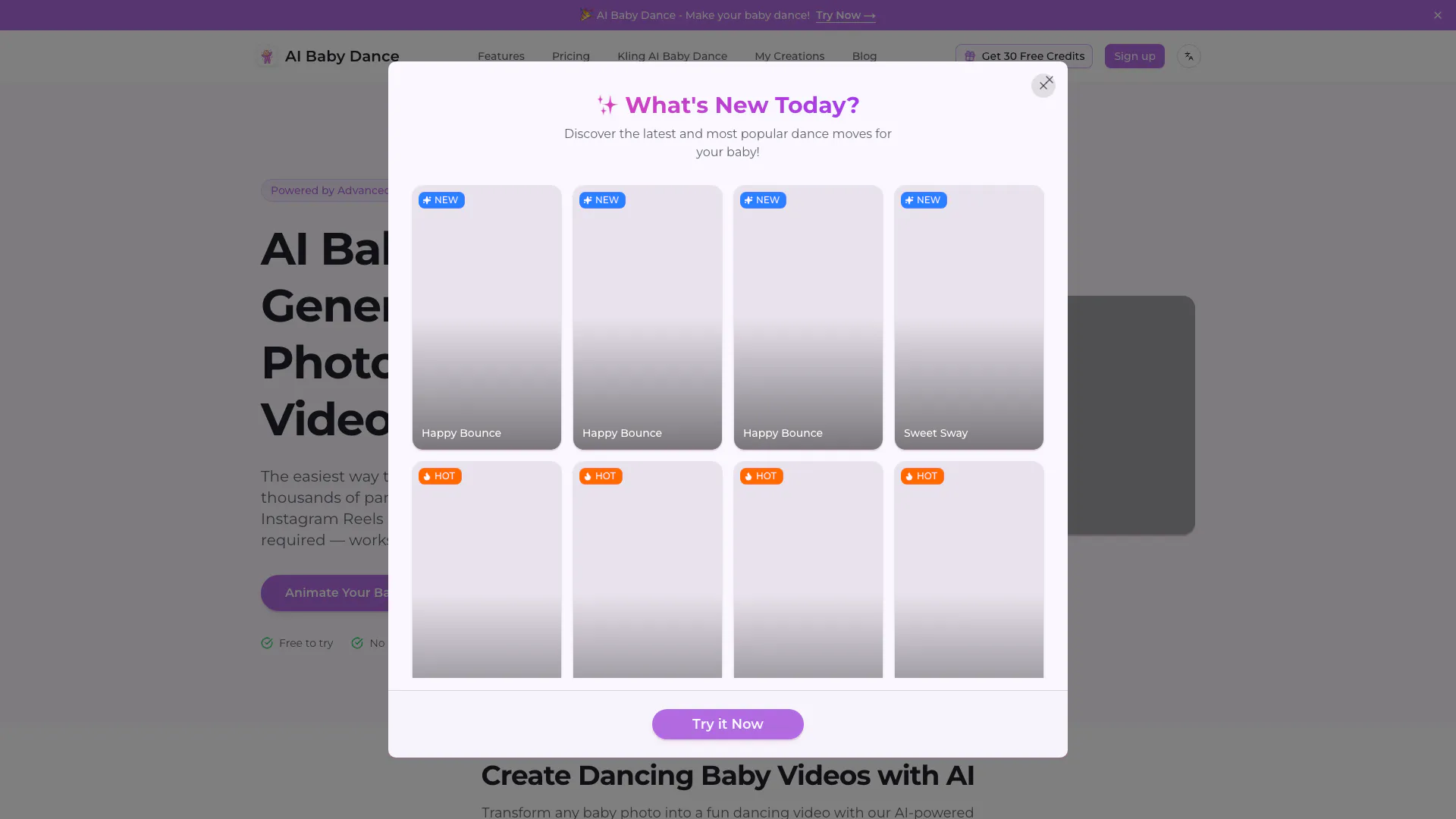 More credits and faster generation for regular creators. Valid for 30 days. Use credits to generate more AI baby dance videos. No watermark: export clean videos. Private storage: securely save your work. Priority queue: faster generation. Commercial license: use for business. Priority support: quick assistance.