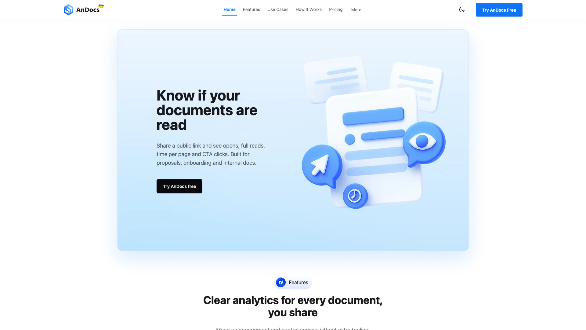 - Comprehensive Engagement Analytics: Andocs provides detailed analytics on document engagement, including opens, full reads, time spent per page, and device breakdowns, allowing users to measure and improve document effectiveness.