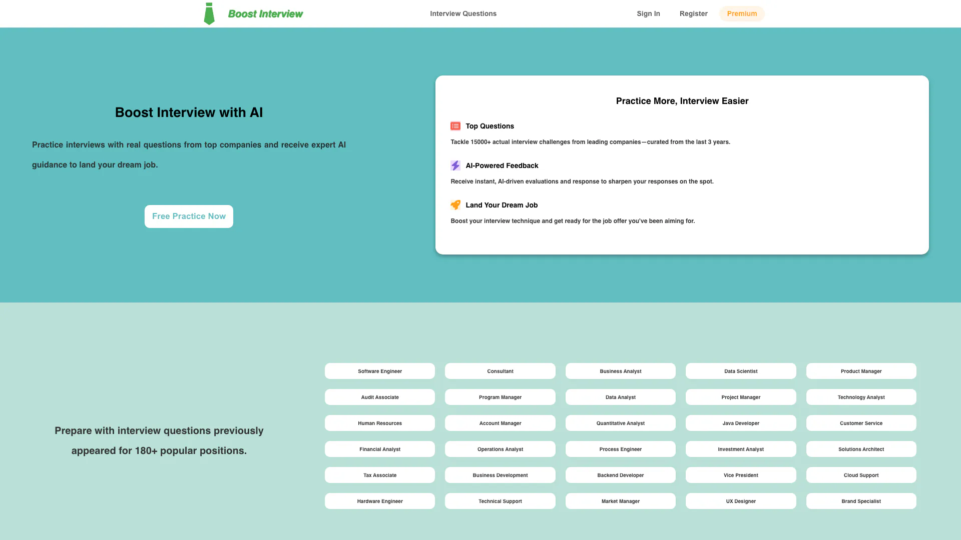 - Tailored Interview Preparation: Prepares candidates for 180+ popular job roles with specific questions and expert guidance, enhancing their interview readiness.
