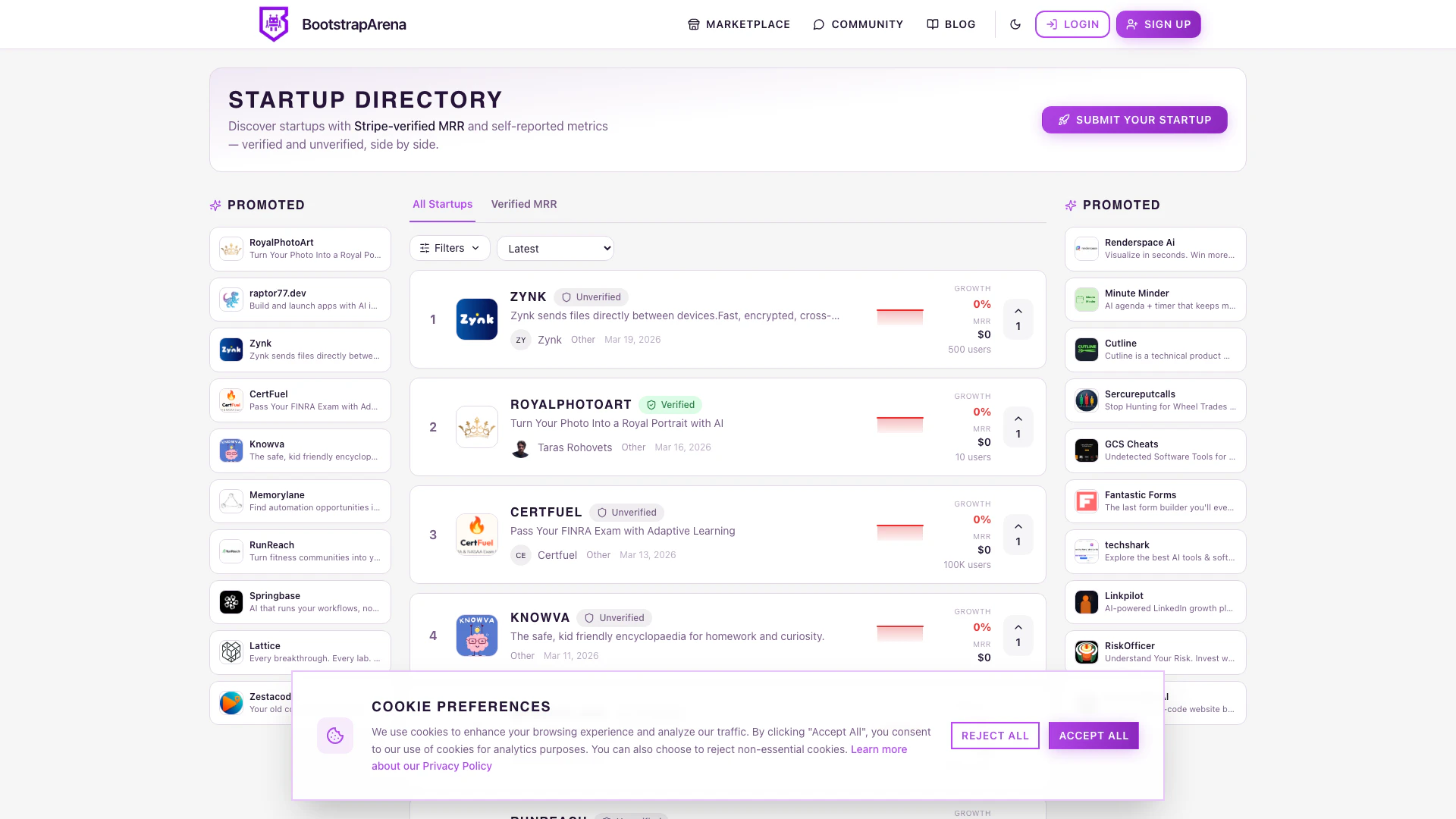 - Startup Discovery: Users can find and explore new bootstrapped startups with verified metrics.