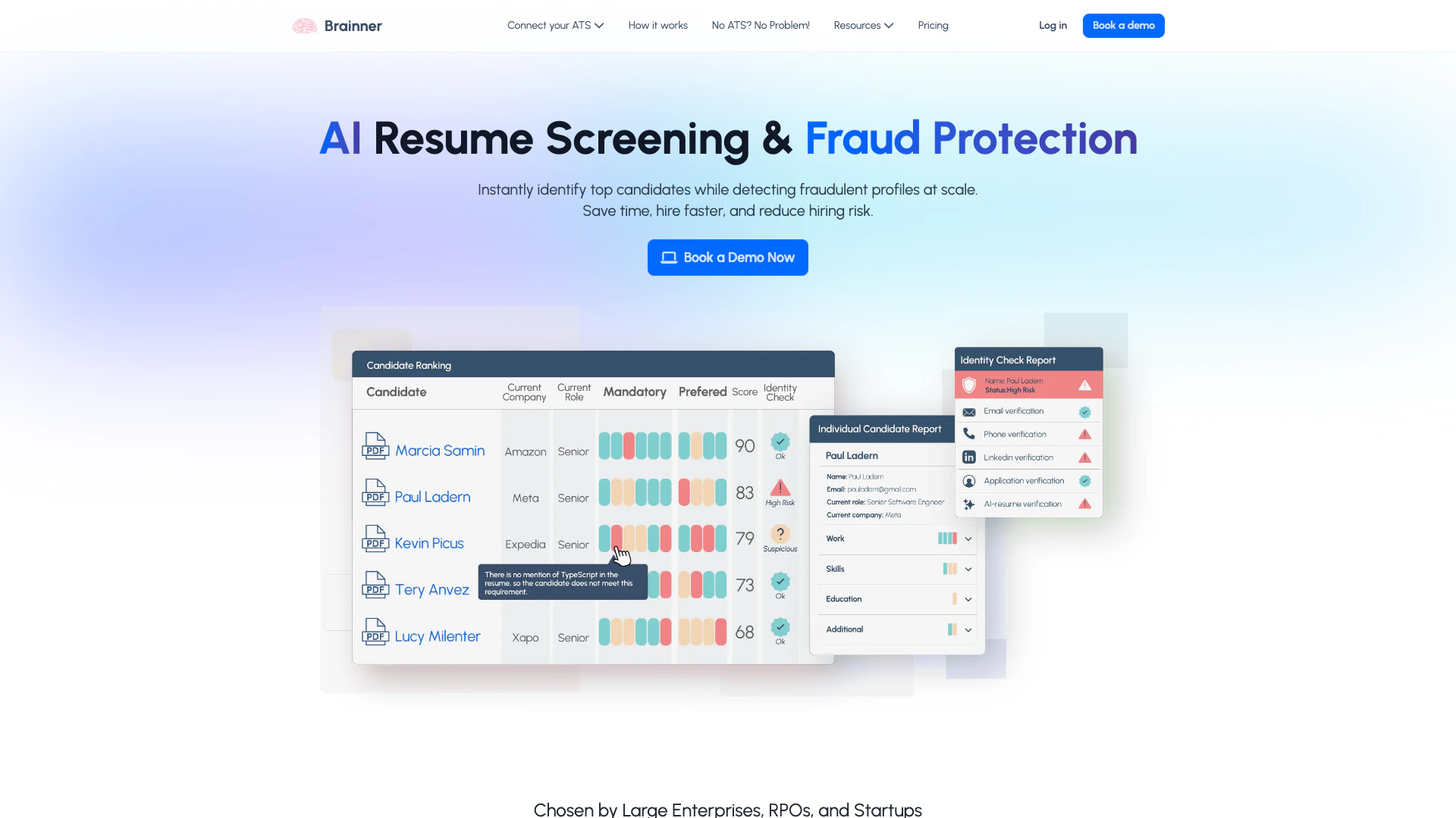 Brainnerai is an advanced AI resume screener[1] designed to revolutionize the recruitment process by providing a 10x faster resume comparison[2] analysis tailored to specific hiring criteria. It seamlessly integrates with leading applicant tracking systems (ATS) and features a built-in resume fraud detection[4] system. This tool empowers HR professionals and recruiters to identify top candidates quickly while mitigating the risks associated with fraudulent applications, thus enhancing the overall efficiency and effectiveness of hiring.