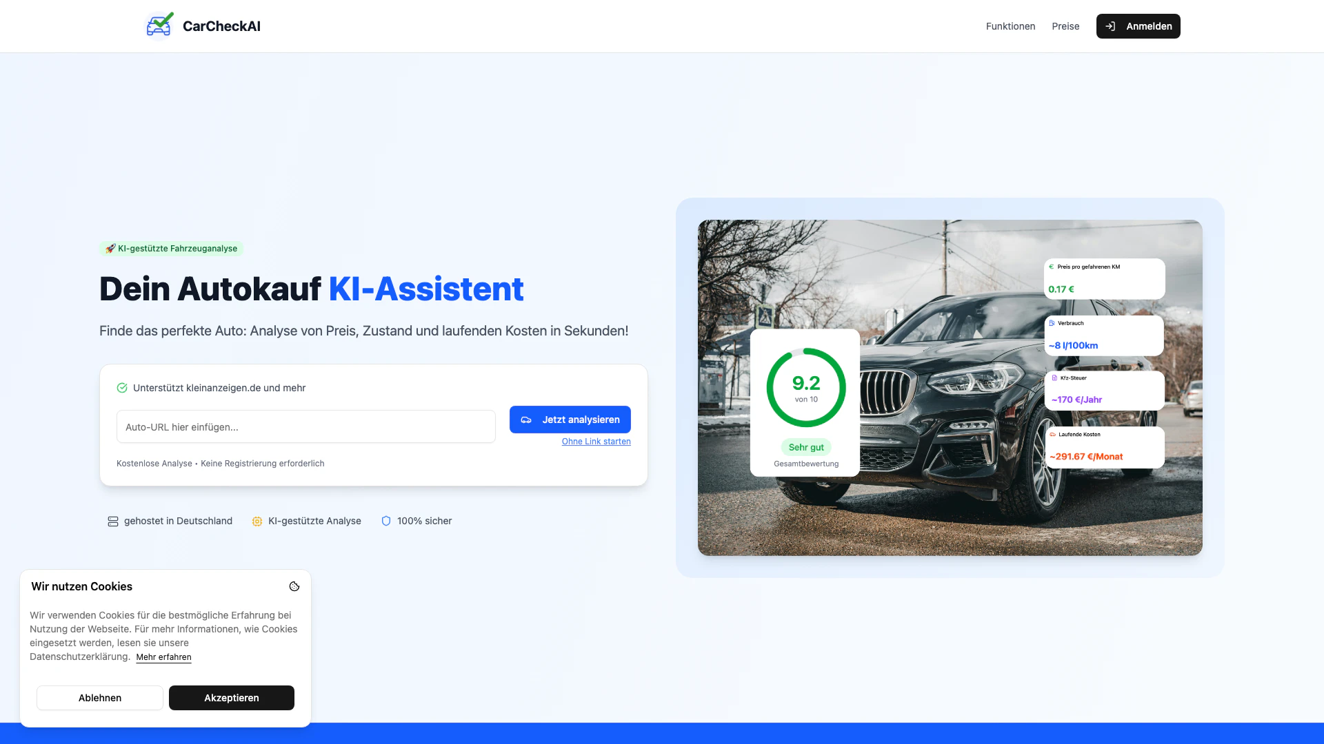 CarCheckAI is an advanced AI-powered[1] tool designed to analyze used cars in seconds, providing insights on price, condition, and ongoing costs. This tool aims to assist potential car buyers in making informed decisions by delivering a comprehensive analysis quickly and efficiently. With its user-friendly interface, CarCheckAI empowers users to identify fair market prices, uncover hidden costs, and assess the overall condition of vehicles. It supports various platforms, including kleinanzeigen.de, ensuring that users can find their perfect car with the help of artificial intelligence.