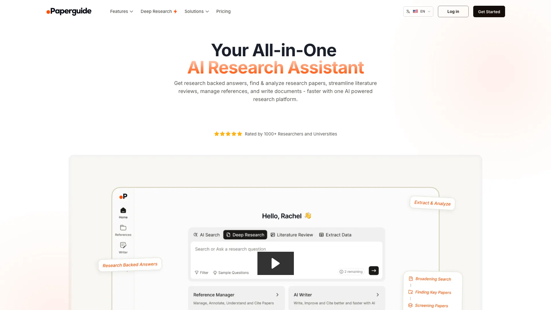 Paperguide is an all-in-one AI Research Assistant designed to help users obtain research-backed answers, find and analyze research papers, manage references, and write documents efficiently. This innovative platform leverages artificial intelligence to streamline the research process, making it easier for students, researchers, and professionals to navigate through vast amounts of academic literature. With features such as AI-powered searches, literature reviews, and citation management, Paperguide aims to enhance productivity and ensure academic integrity in writing.