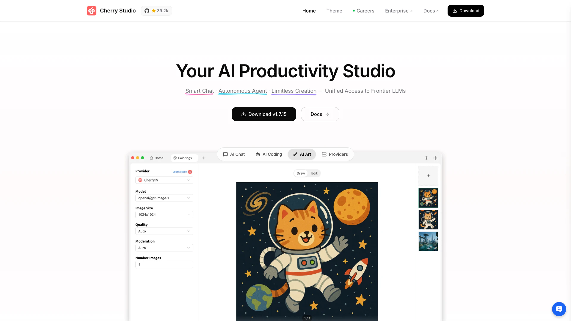 Cherry Studio is a cross-platform desktop client for AI chatbots, supporting Windows, macOS, and Linux. It integrates 300+ AI models from major providers like OpenAI, Claude, Gemini, and supports local models via Ollama and LM Studio. Beyond AI Assistants, Cherry Studio features powerful Agent capabilities - autonomous AI that can think, plan, and act. Give Agent a goal, and it will reason through problems, break them into steps, call the right tools, and execute independently while you stay in control.