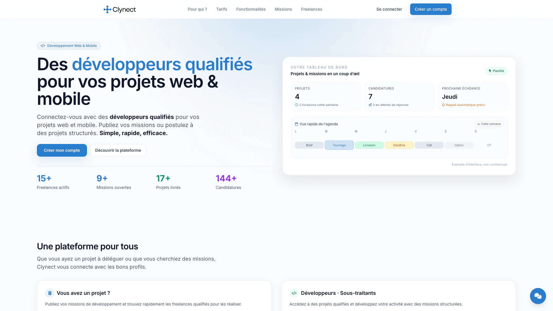 Creating an account is completely free for everyone. Freelancers must subscribe to a plan to access the platform's features. Publishing and managing your missions is free, with no subscription required.