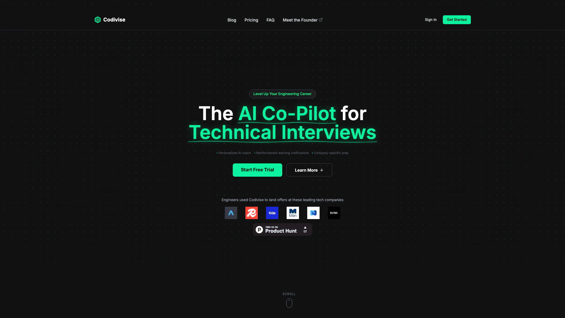 Codivise is targeted towards software engineers and tech professionals who are preparing for coding interviews at major technology companies. This includes candidates aiming for positions in FAANG companies (Google, Meta, Amazon, Apple, Netflix), as well as other tech giants and unicorns. It is suitable for individuals looking to enhance their coding skills, improve their interview performance, and achieve significant salary increases.